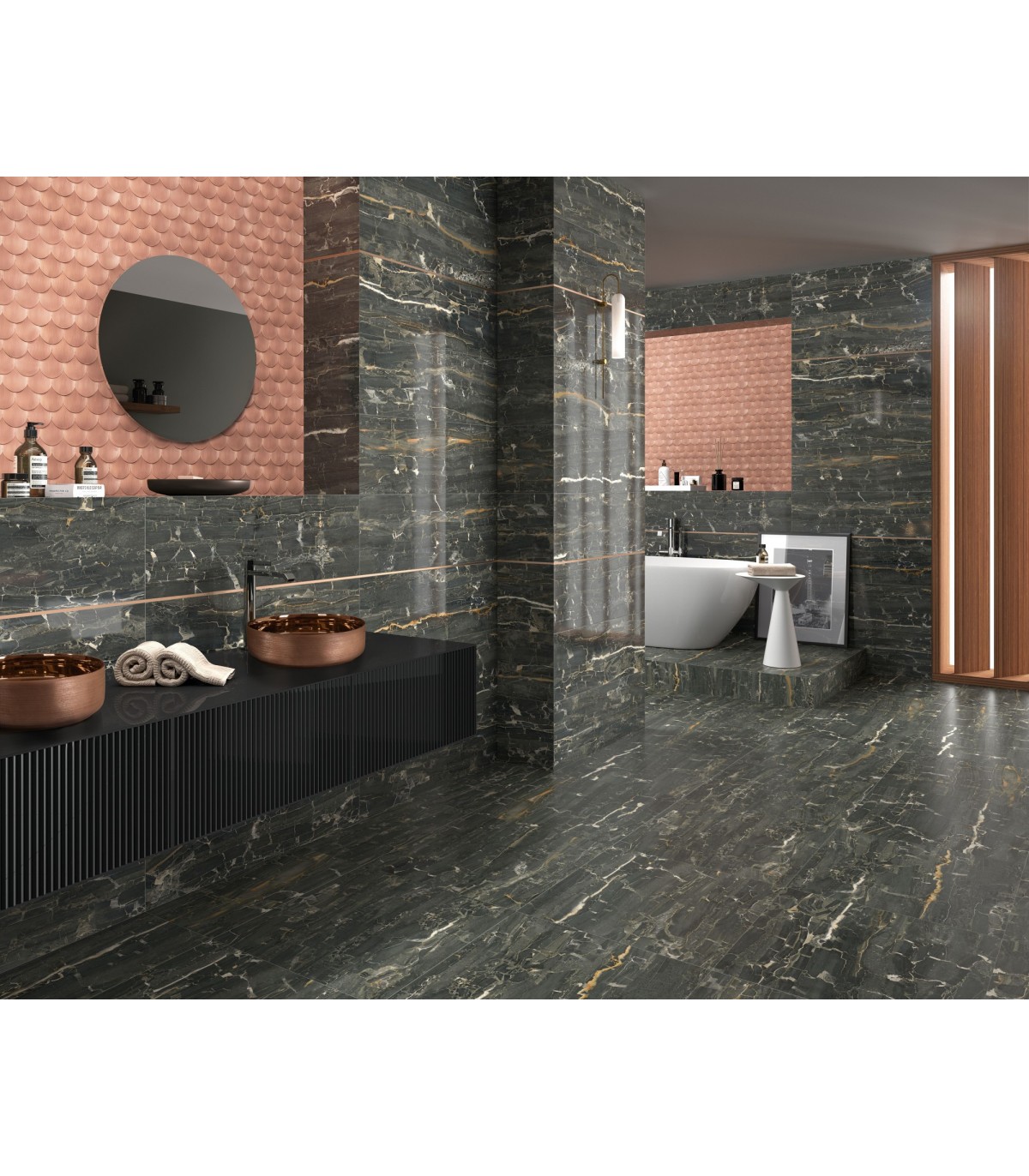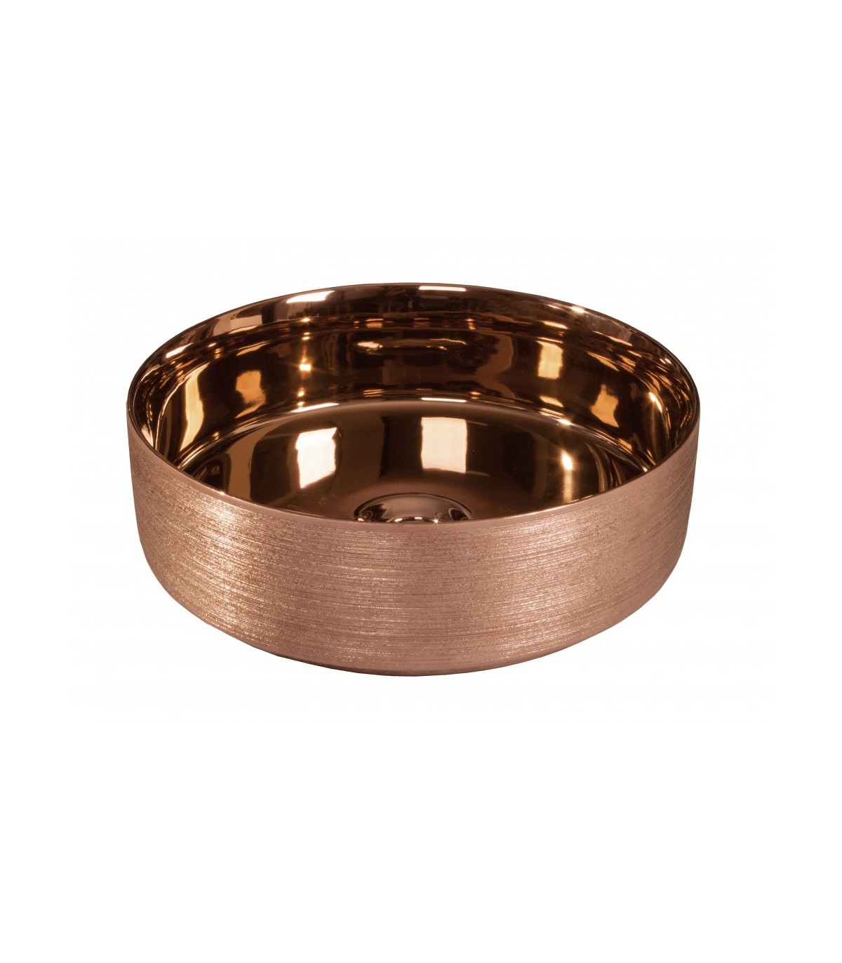 Lavabo decorativo ROSE GOLD. Realizado en porcelana recubierta de PVD cobre. Diámetro 36cm. Elegante lavabo de porcelana en la sugerente tonalidad ROSE GOLD, con el interior brillo y el exterior satinado, surcado por finas líneas que interactúan con la luz. Medidas 360x360x120 cm.