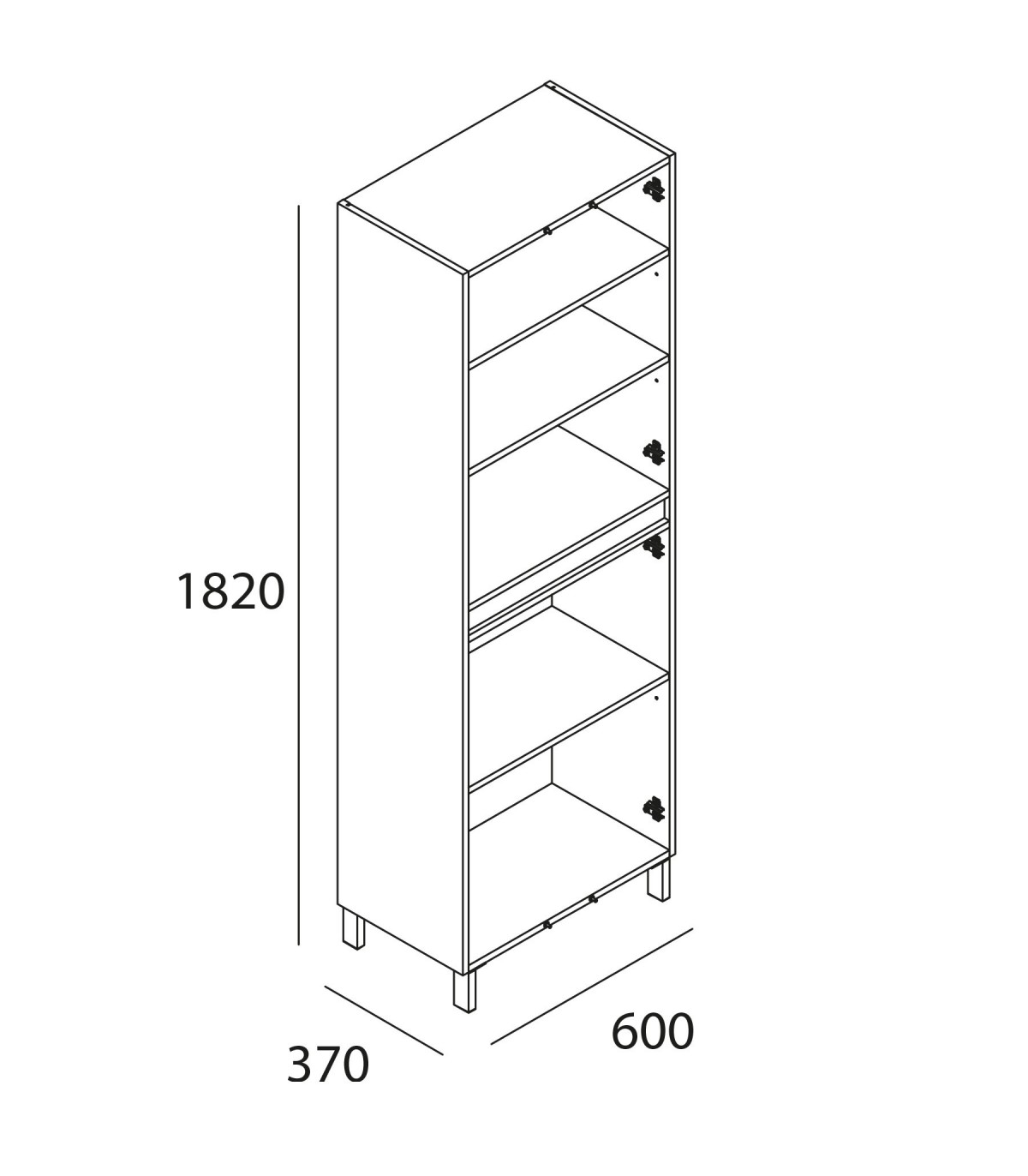 Fabricación estructura interna (espesor=16mm): tablero de partículas laminado acabado Cuero Nude. Frente y laterales fabricados en tablero de partículas laminado de 16 mm (clase E-1) con cantos en PVC (con cola PUR). Colores: Blanco lacado brillo, gris mate y acabados en madera, Roble caledonia y Roble eternity. Dimensiones 600 x 1820 x 370 mm.