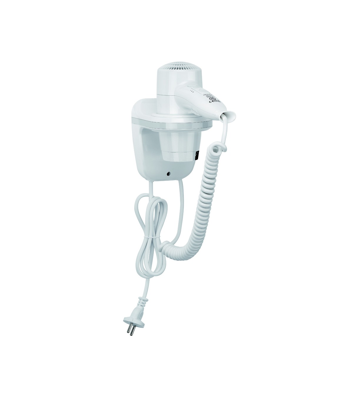 Secador de pelo manual para hotel de color blanco, para instalar en la pared, funcional, robusto y con un diseño actual.