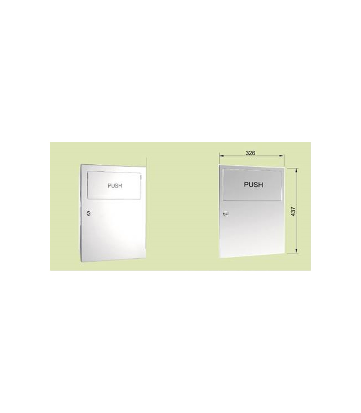 CUERPO: de acero inoxidable AISI 304, de 0,8 mm espesor, con un acabado satinado en todas aquellas partes vistas. PUERTA: de acero inoxidable AISI 304, de 0,8 mm espesor, acabado satinado, fijada al cuerpo mediante una bisagra de piano. Se abre y cierra a través de una cerradura de cilindro con llave estándar Mediclinics. TAPA: con auto retorno y de accionamiento manual, fabricada acero inoxidable