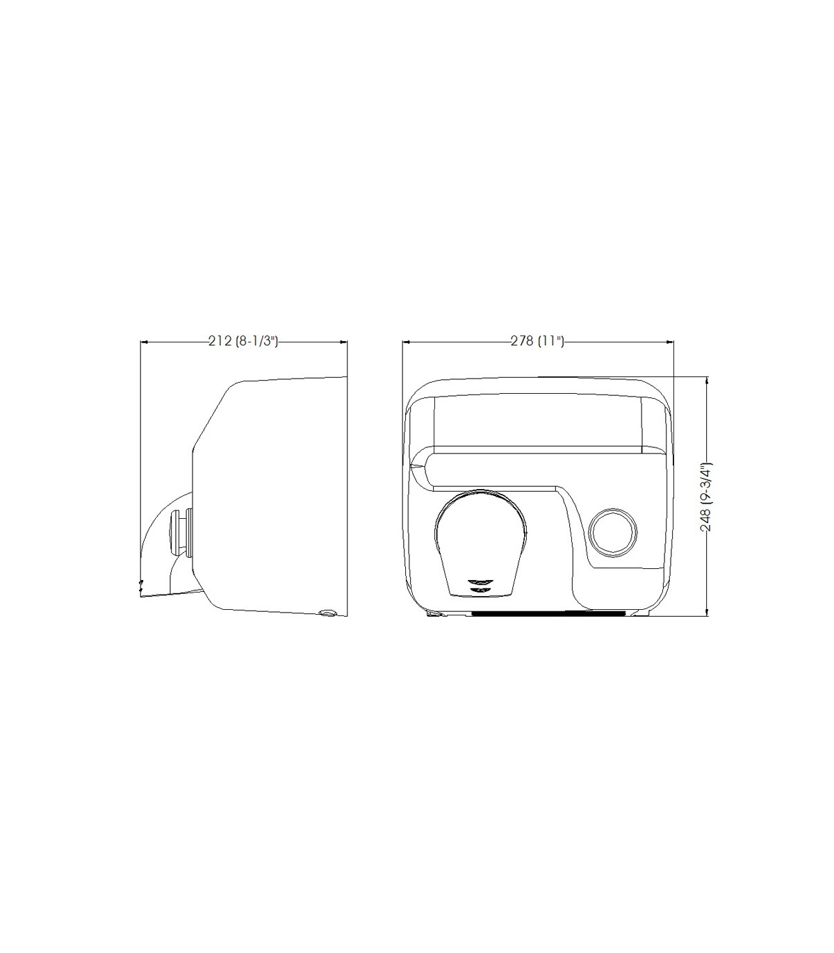 Secador de manos con carcasa de acero inoxidable, sin soldaduras y antivadálica. Pulsador de zamak cromado con temporizador de 35 segundos.
