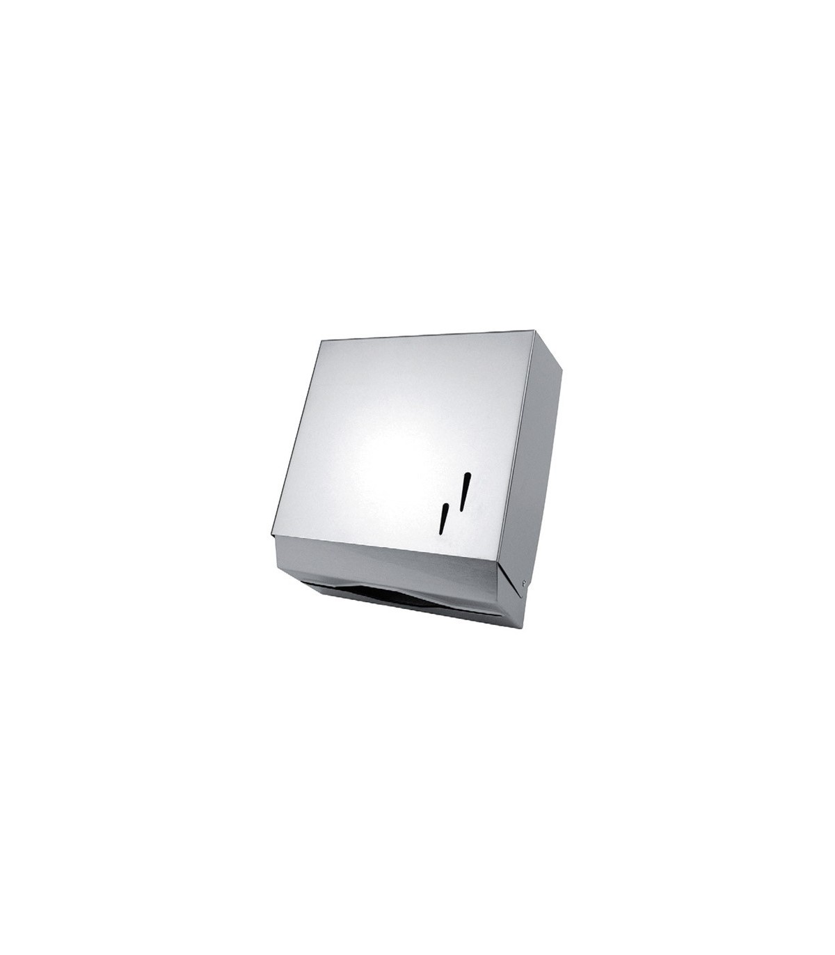Dispensador de toallitas Inox ZIG-ZAG. Tipo de toallitas: plegadas en C, o plegadas en Z, dimensiones máximas de toallitas 100 x 260 mm. Capacidad: 600 toallitas plegadas en Z, 400 toallitas plegadas en C. Altura instalación recomendada 1.300-1.600 mm.