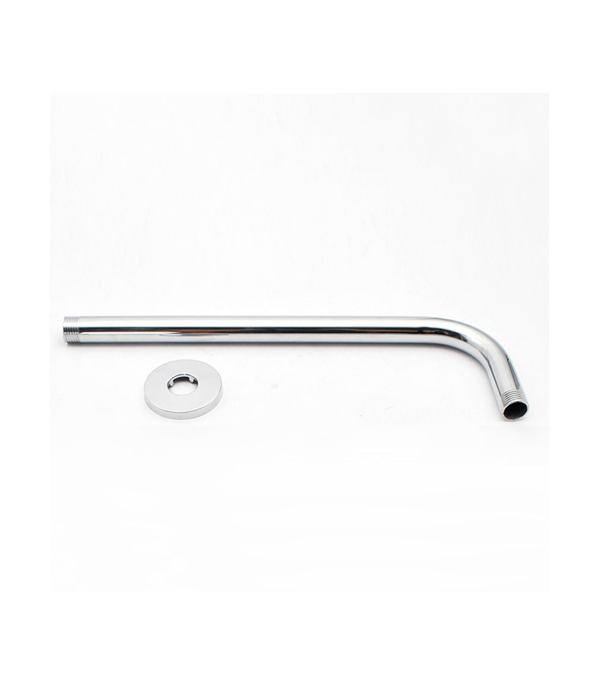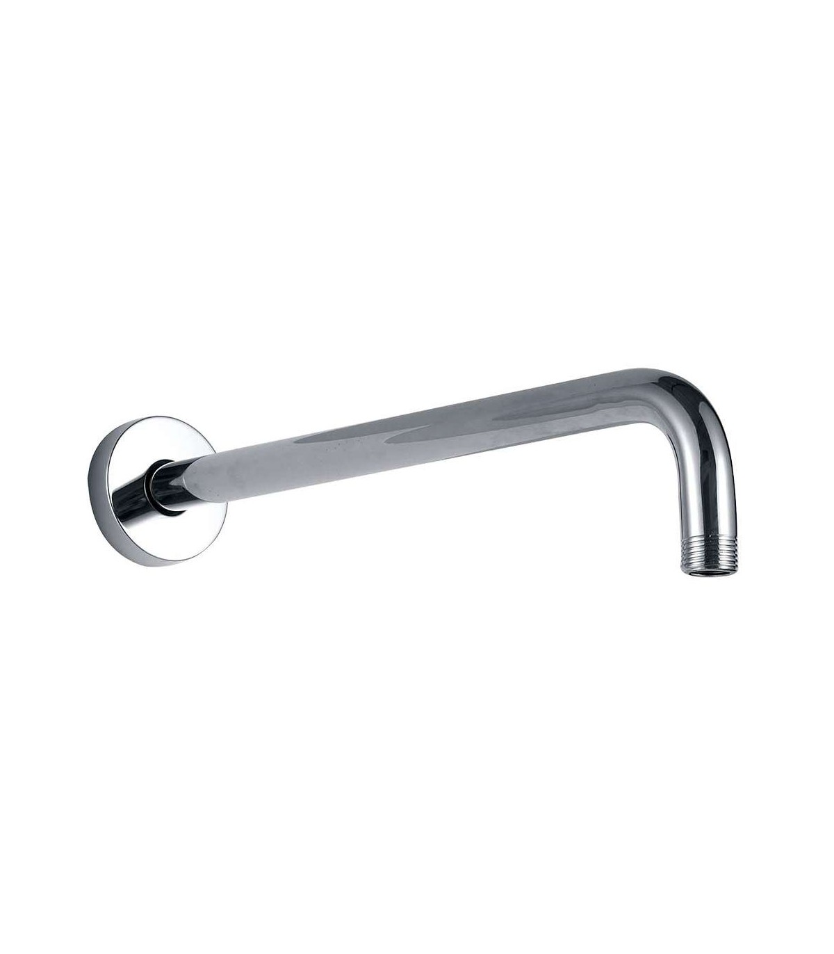 Brazo soporte para duchas rociador fijo, brazo de ducha fabricado en latón y acabo en cromo brillo, con embellecedor circular para esconder los anclajes.