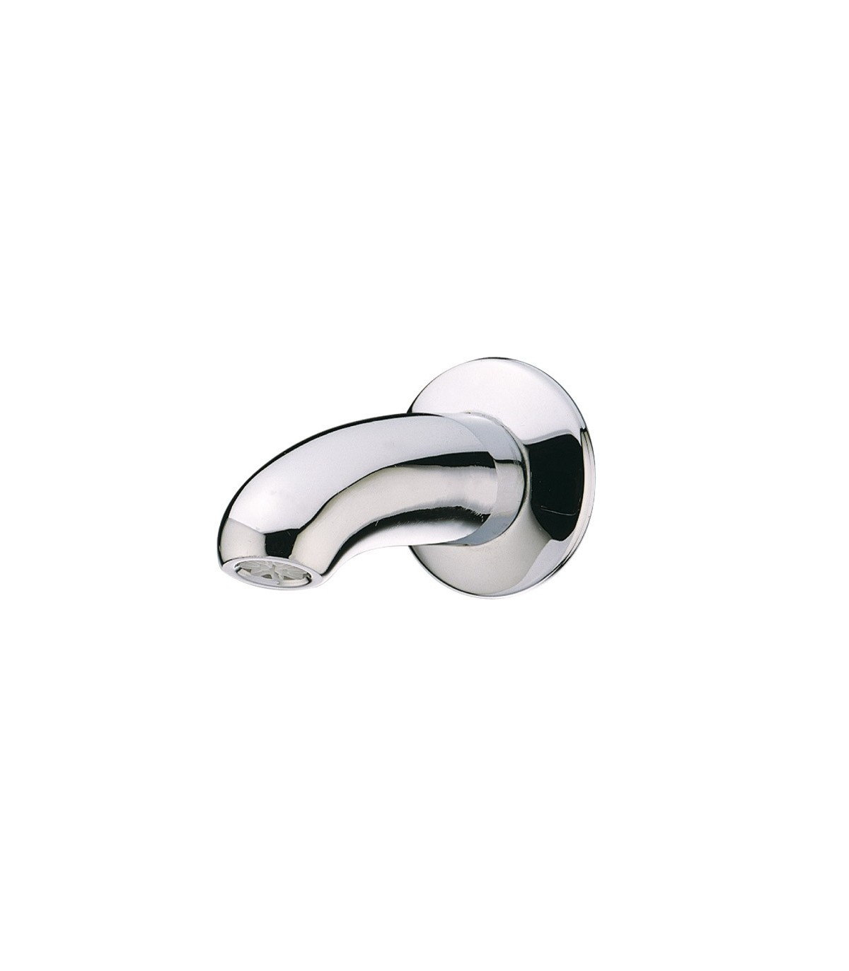 Caño fijo curvo para fijación a través de muro en latón cromado con rompeaguas.