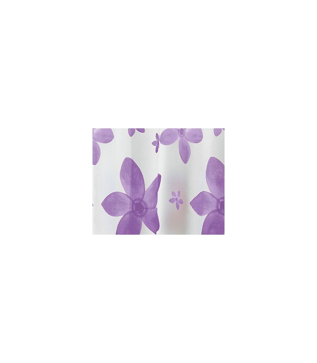 Cortina de baño color lila con anillas Modelo G.Dafne Ancho:1,80m. Cortina 100% poliéster y tratadas con TEFLON®, para que sean impermeables y resistentes a las manchas. El borde inferior contiene un hilo de polipropileno para que la cortina esté siempre en orden y tiesa. La cortina se suministra completa de ganchos.