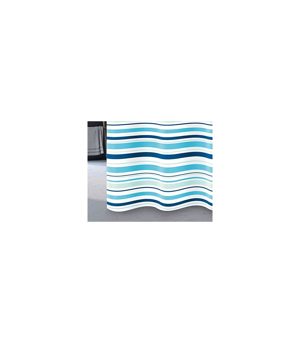 Cortina de baño color azul con anillas modelo G.RIGHE Ancho: 2,40m. Cortina 100% poliéster y tratadas con TEFLON®, para que sean impermeables y resistentes a las manchas. El borde inferior contiene un hilo de polipropileno para que la cortina esté siempre en orden y tiesa. La cortina se suministra completa de ganchos.
