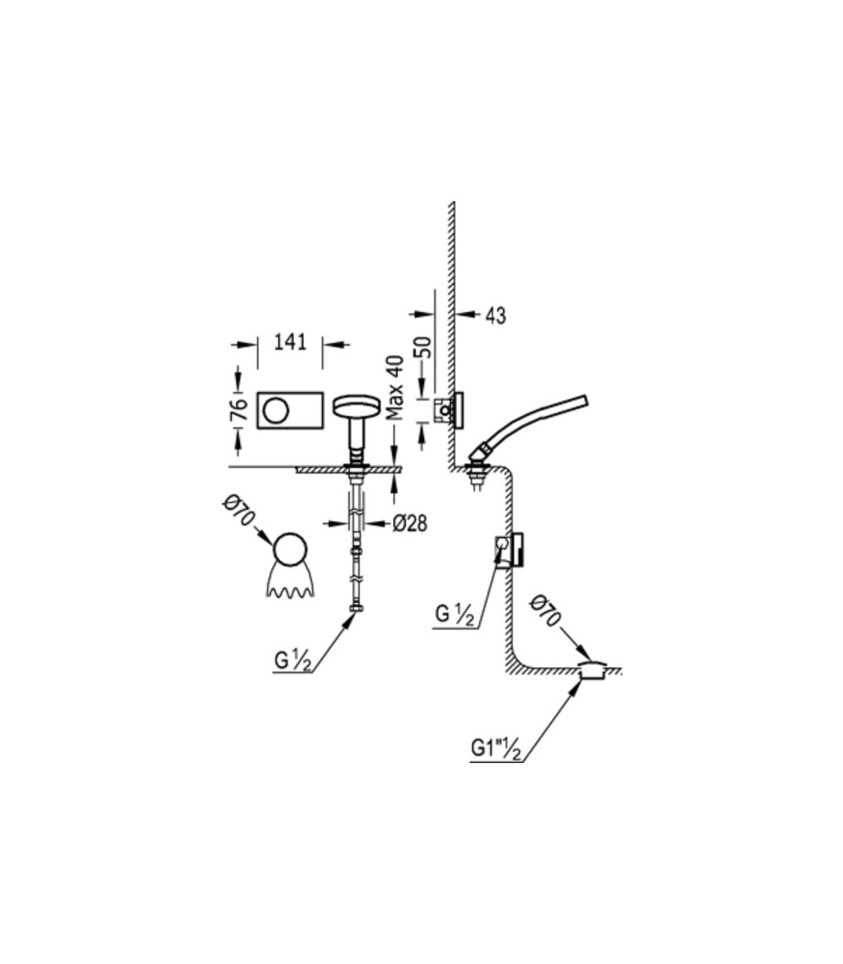 Kit electrónico de bañera termostático empotrado · Desagüe bañera y válvula de llenado redonda CASCADA con rebosadero (1.34.534.30). · Sifón PVC bañera (1.34.634.60). · Ducha masaje, 5 posiciones. (299.631.06). · Flexo doble engatillado.