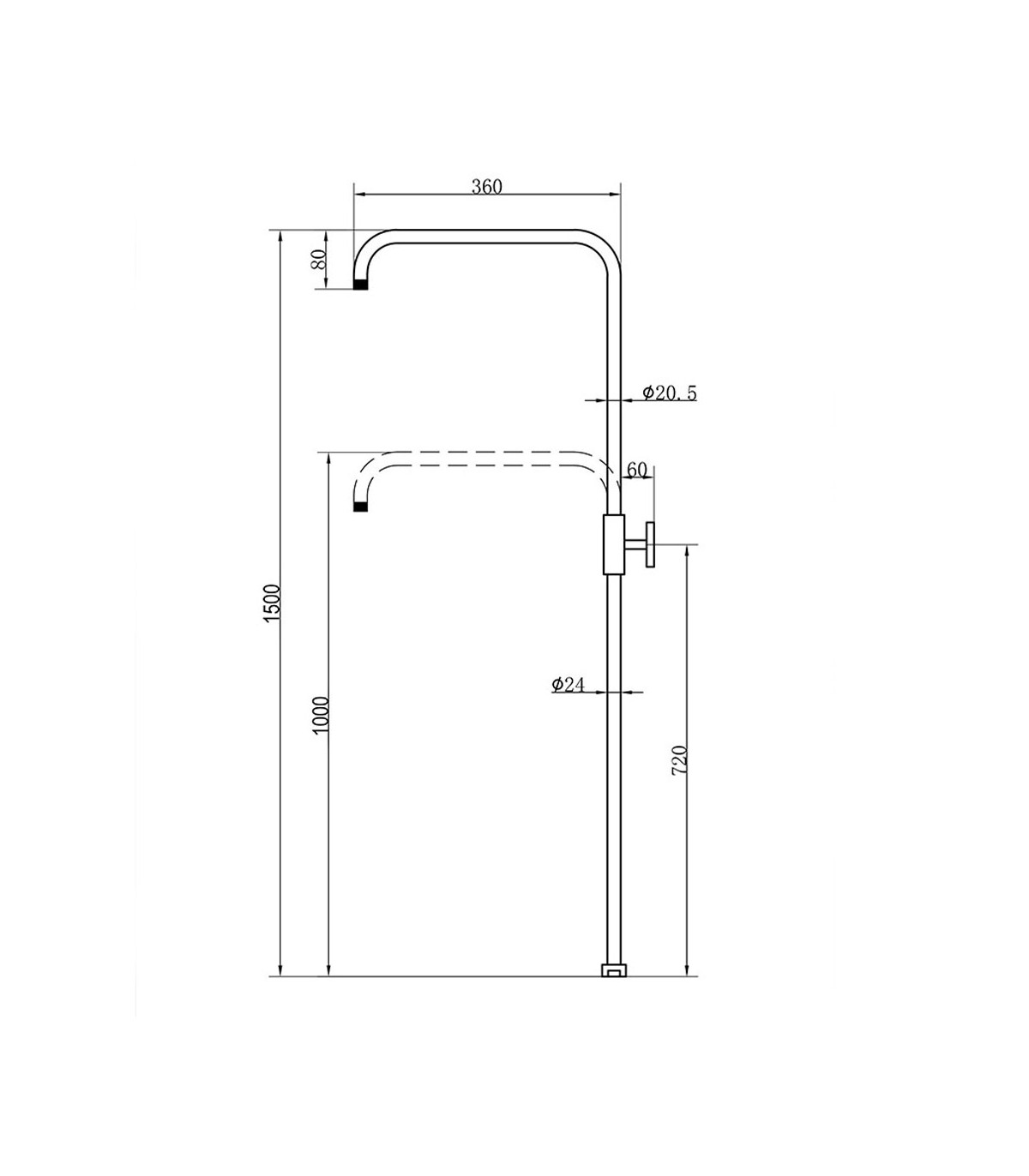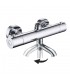 Grifo termostático con caño inferior. Flexo. Maneral cuadrado de 1 posición con sist antical. Tubo redondo de 22mm extensible de 100cm. a 150cm. de latón. Rociador superior cuadrado de 20x20cm.