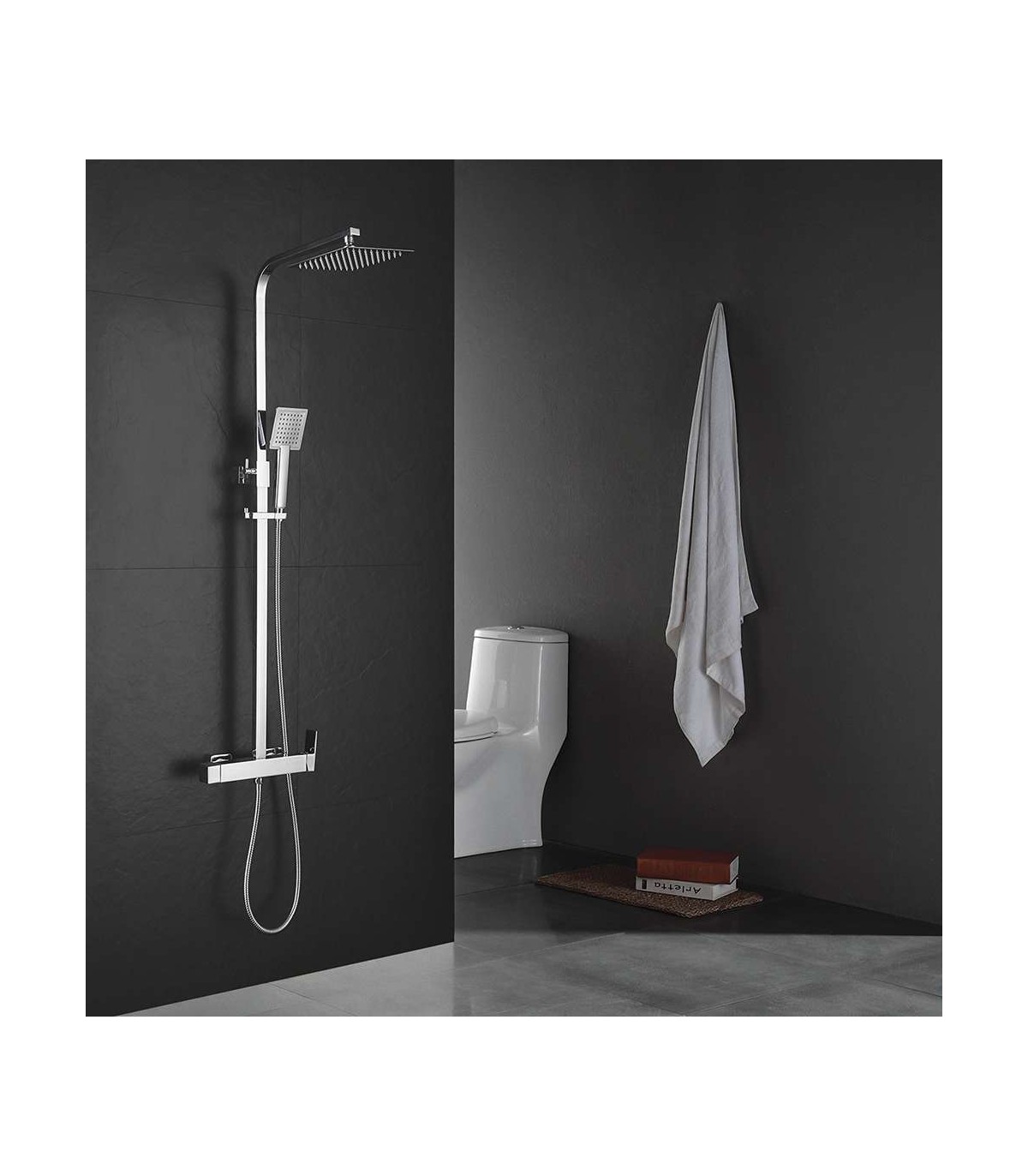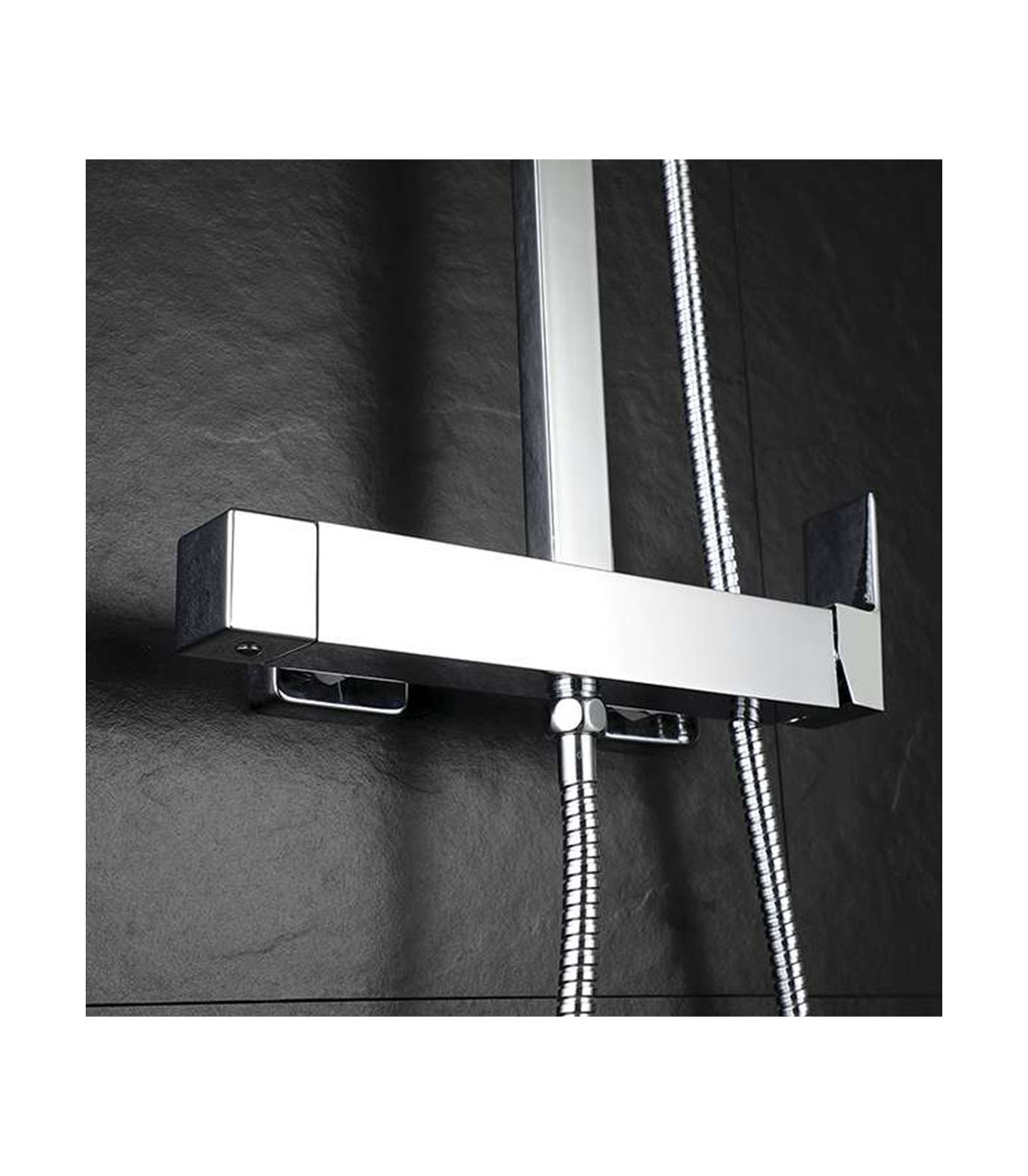 Grifo monomando, Flexo, maneral cuadrado de 1 posición y sistema antical, tubo extensible, Rociador superior, soporte deslizante para mango de ducha. Embellecedores y excéntricas, soportes de pared.