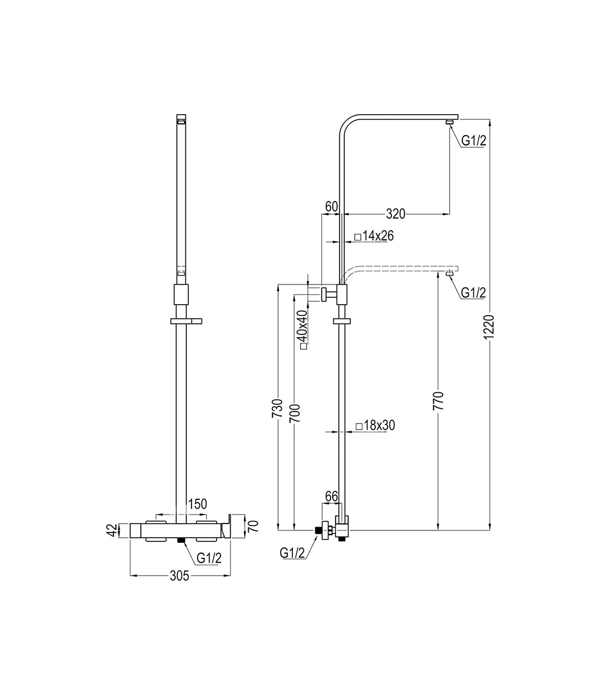 Columna de ducha monomando modelo Cherokee y tubo cuadrado extraplano regulable en altura de 73 a 122 cm. Duchón rociador de 20x20 cm., con caída de agua efecto lluvia para una relajante ducha.