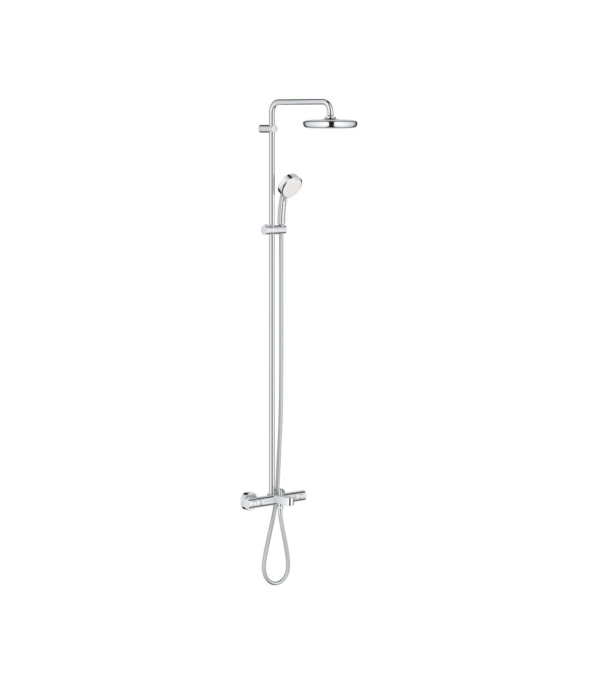 El versátil sistema de ducha GROHE Tempesta Cosmopolitan 210 con termostato de bañera aporta un toque de diseño inmediato y un rendimiento máximo a cualquier baño. Ideal para familias, el sistema incluye un termostato Grohtherm 1000 Cosmopolitan con una cómoda salida de bañera, e incorpora la vanguardista tecnología de GROHE. Ajusta la temperatura deseada con GROHE TurboStat y el agua se mantendrá