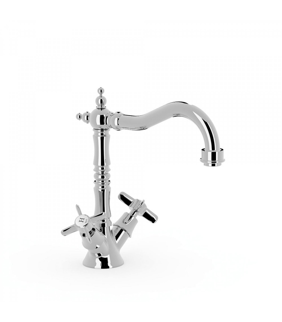 Grifo bimando para lavabo con acabado cromado y maneta de timón. Caño giratorio con angulo de 360º.