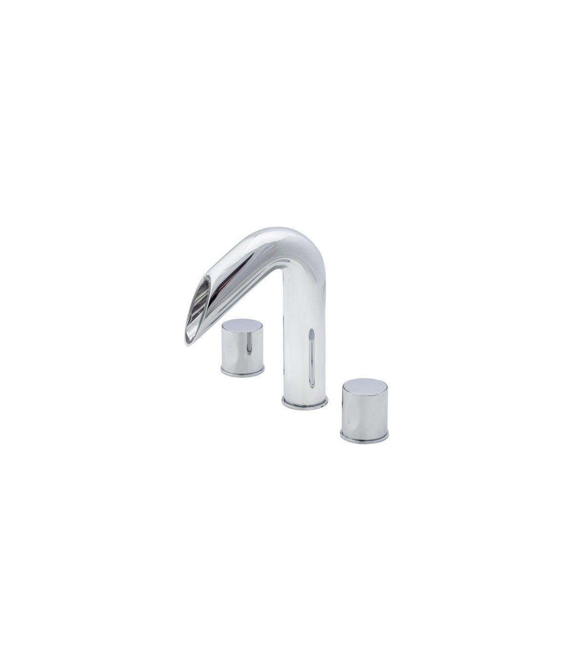 Batería de lavabo mural bimando. Colección de estética minimalista extremadamente singular. El agua fluye en forma de cascada. Diseñada por el prestigioso proyectista Lorenzo Damiani y galardonada con GOOD DESIGN AWARD 2007.
