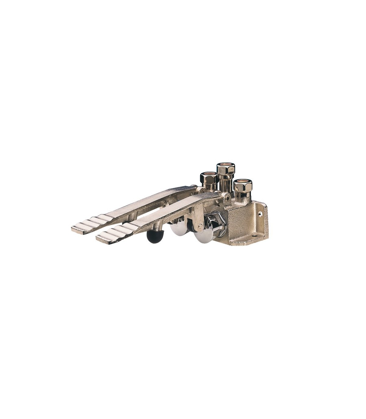 Cierre automático: 4 ± 2 s. Caudal: 6 l/minuto. Caudal regulable por el instalador en función de la presión. Entrada y salida con juntas y tuercas racor para tubo de Ø 10 x 12 mm. Apertura por pedal. Cabeza intercambiable que comprende todo el mecanismo del grifo. Cuerpo y pedal antideslizante, piezas interiores en materiales resistentes a la corrosión y a las incrustaciones calcáreas. Base de apo