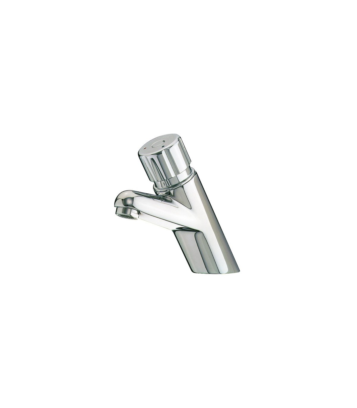 Grifo temporizado antiblocaje mezclador para instalación sobre repisa con cuerpo de latón cromado. Mezclador en pulsador y limitador de temperatura.