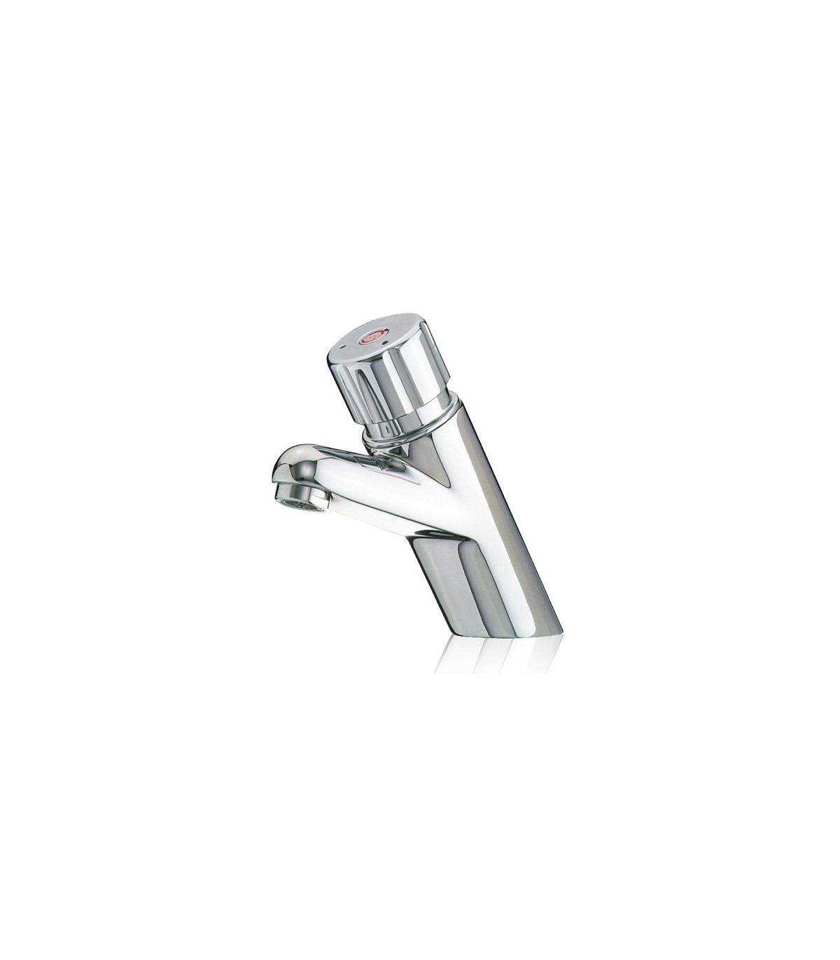 Grifo temporizado ecológico antiblocaje mezclador para instalación sobre repisa con cuerpo de latón cromado. Mezclador en pulsador y limitador de temperatura.