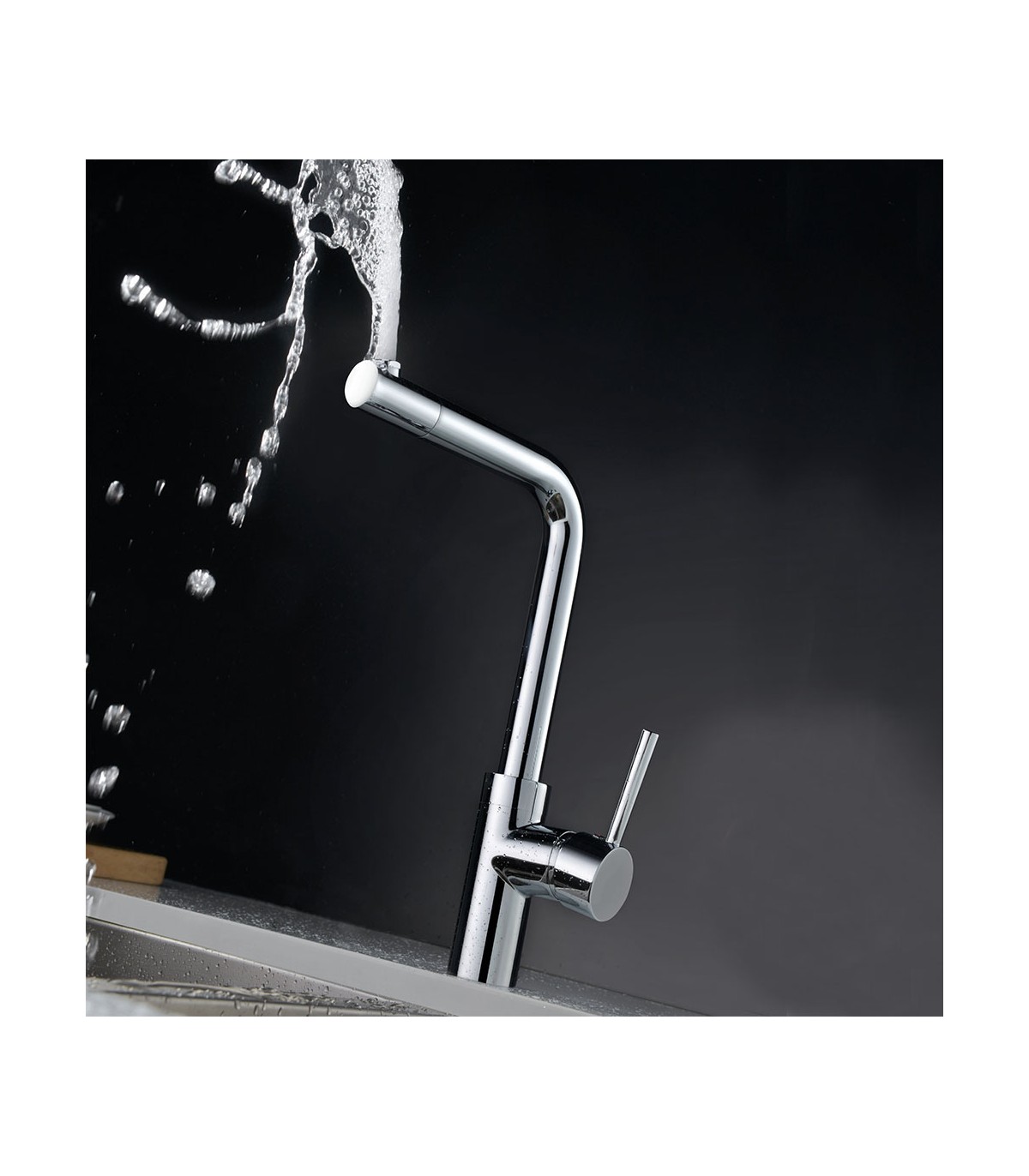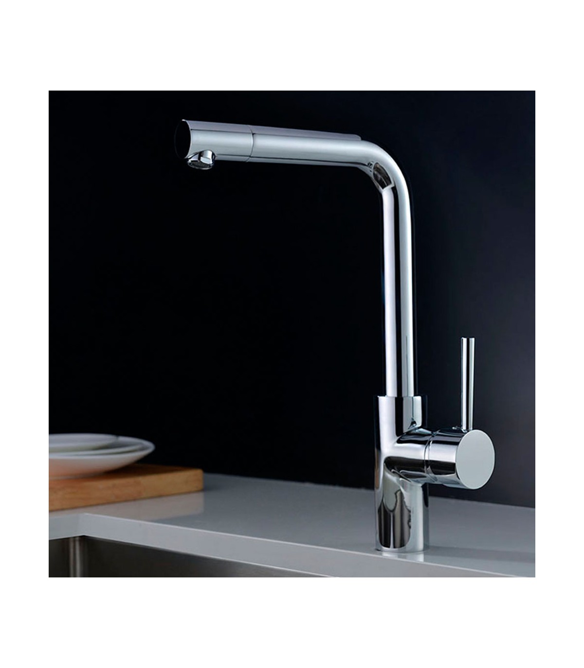 Grifo monomando de cocina fregadero ZELANDA de caño alto orientable 360º. El grifo abatible tiene un atomizador en la parte superior del caño orientable que gira hasta 360º.