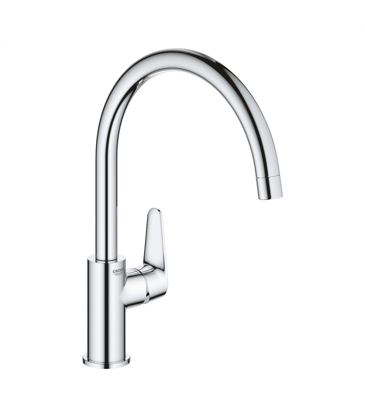 Grifo monomando de fregadero de la serie BAU CURVE de Grohe. Diseño de caño alto con Starlight (acabado cromado). Cartucho de discos cerámicos Longlife de 28mm. Consuctos de agua internos aislados sin plomo ni niquel. Caño con mousseur integrado. Caño tubular giratorio 150º. Incluye conexiones flexibles.