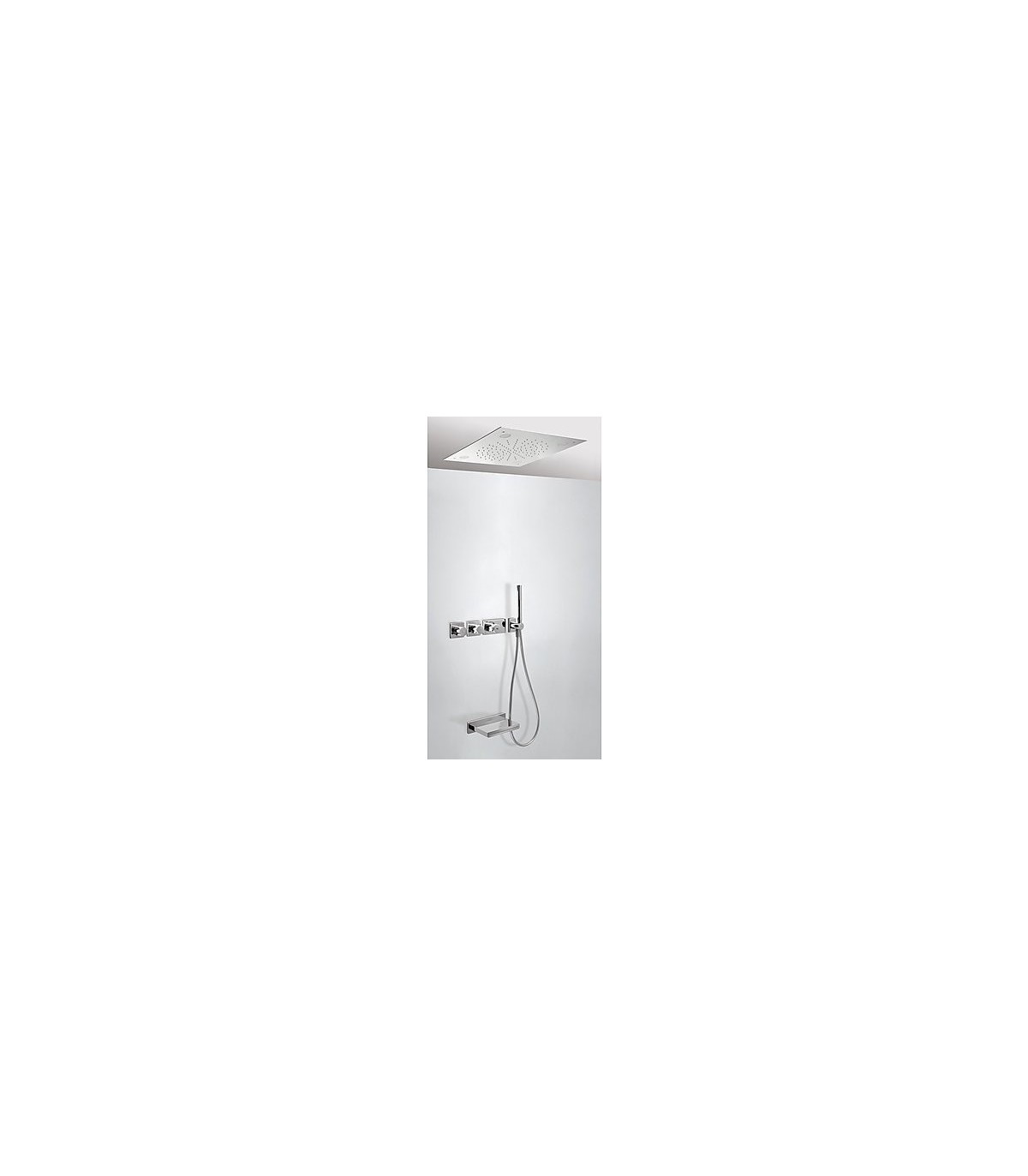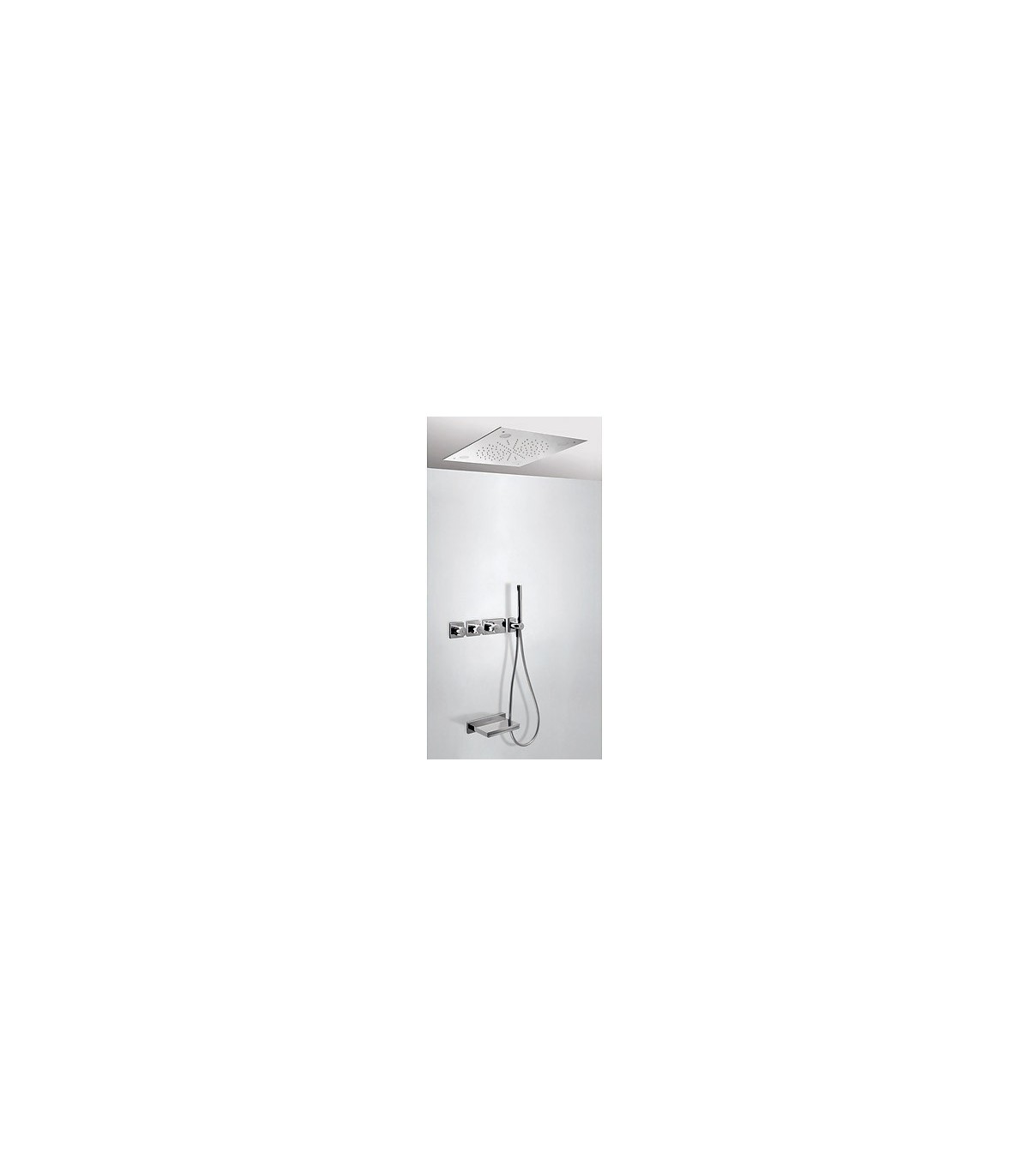 Kit de bañera termostático empotrado CROMOTERAPIA con cierre y regulación de caudal. (3 vías). · Cuerpo empotrado termostático incluido. · Rociador ducha a techo 500x500 mm. (299.962.01). · Caño cascada INOX. · Ducha móvil anticalcárea (034.116.01). · Fle Descarga la ficha técnica aquí
