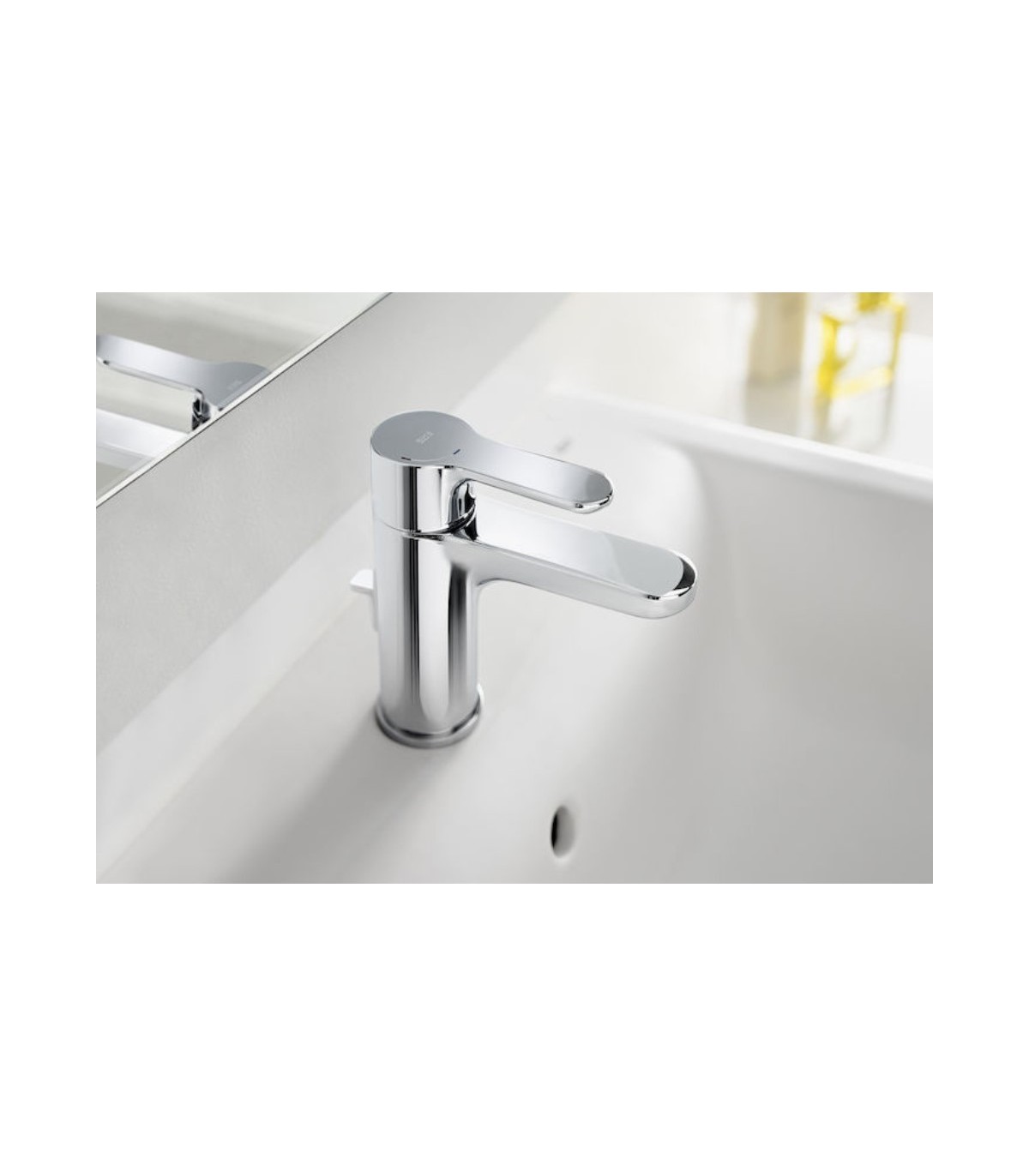 Mezclador monomando para lavabo con maneta lateral de la serie L20 de Roca con desagüe automático y enlaces de alimentación flexibles. Apertura de agua fría (ColdStart) que proporciona ahorro de agua y energía....