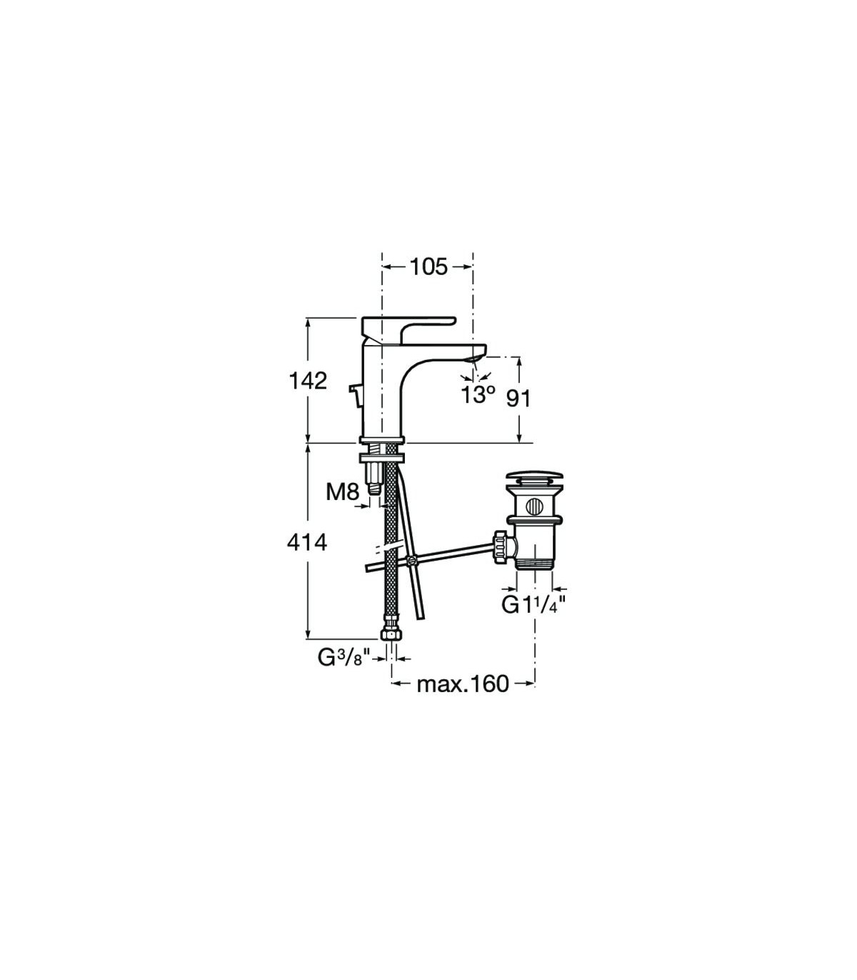 Mezclador monomando para lavabo de la serie L20 de Roca con cuerpo liso y enlaces de alimentación flexibles. No incluye desagüe clic-clac. Apertura Coldstart en agua fría para ahorro de agua y energético. Acabado...