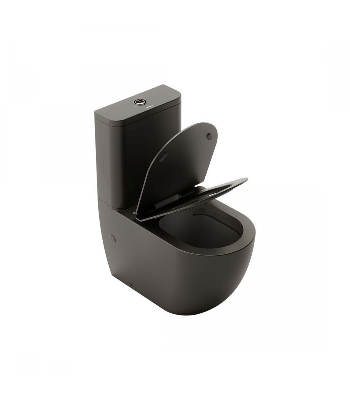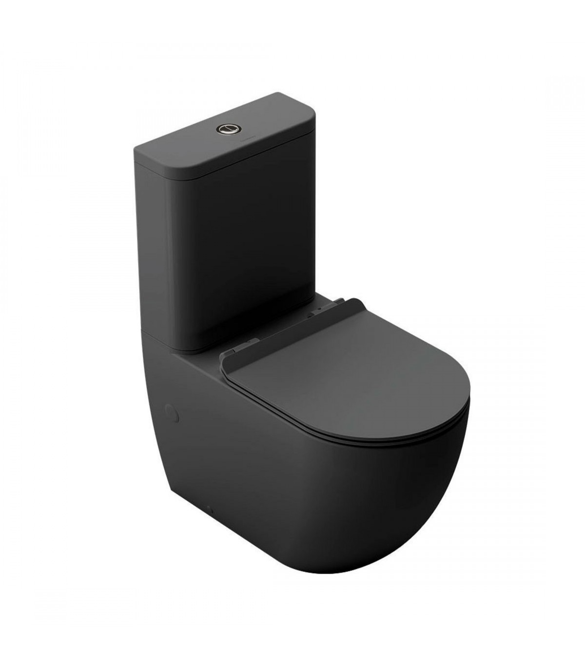 Inodoro con teminación en color negro mate. Tapa extraplana amortiguada fabricada en Duroplast (Resina termoendurecida), el material más resistente del mercado para tapas de inodoro. Salida dual, no es necesario elegir la salida de agua para su instalación, se adapta tanto a suelo como a pared.
