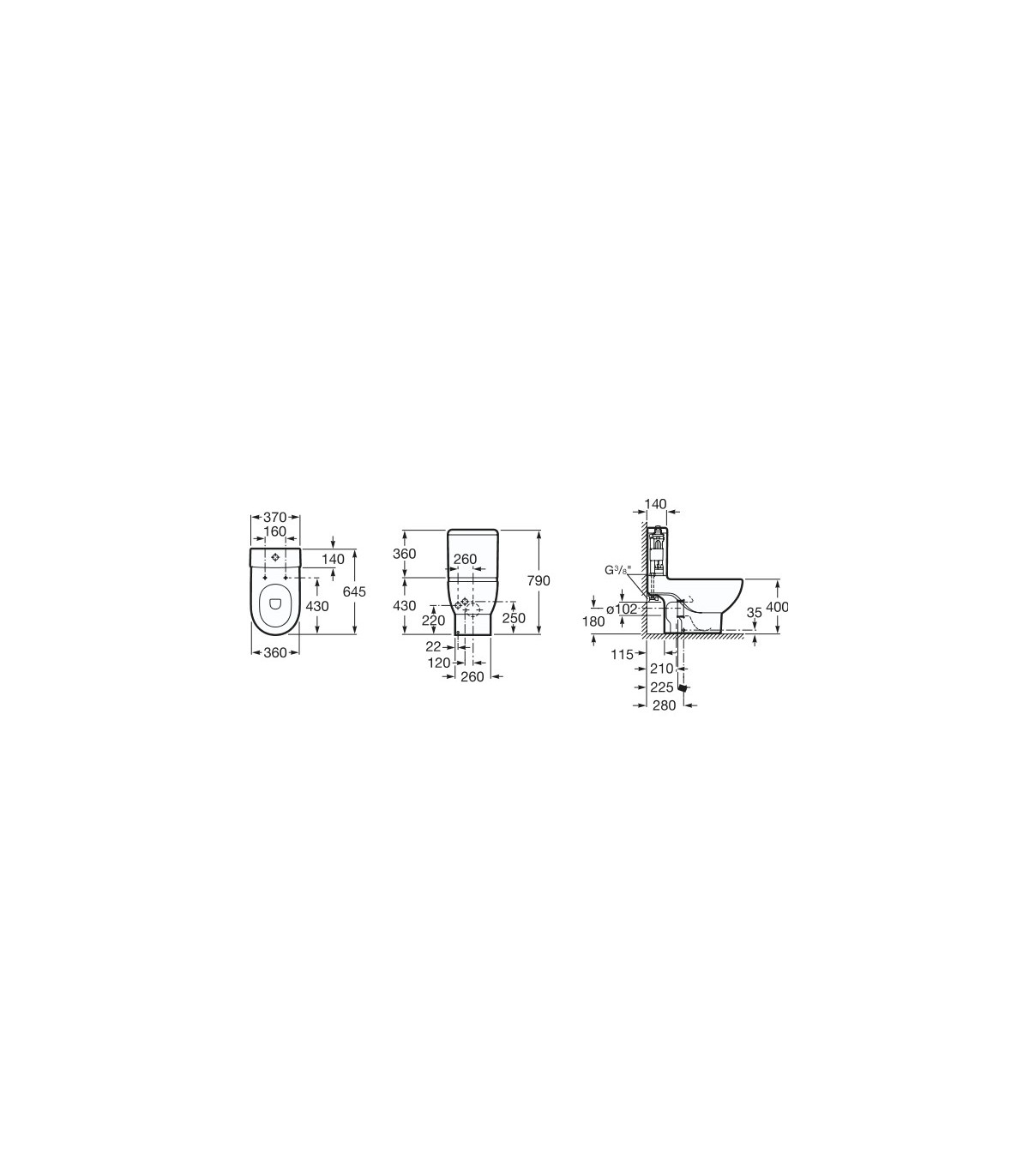 Inodoro compuesto por:   - Taza salida dual con juego de fijación Ref. A342245000, Tanque completo con mecanismo de doble descarga 3/4,5 litros (Ref. A341241000). Asiento y tapa lacados, con bisagras de acero inoxidable (Ref. A8012A0004) o de caida amortiguada (Ref. A8012A2004). No incluye codo de evacuación vertical.