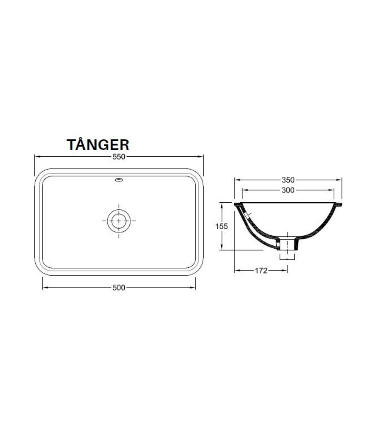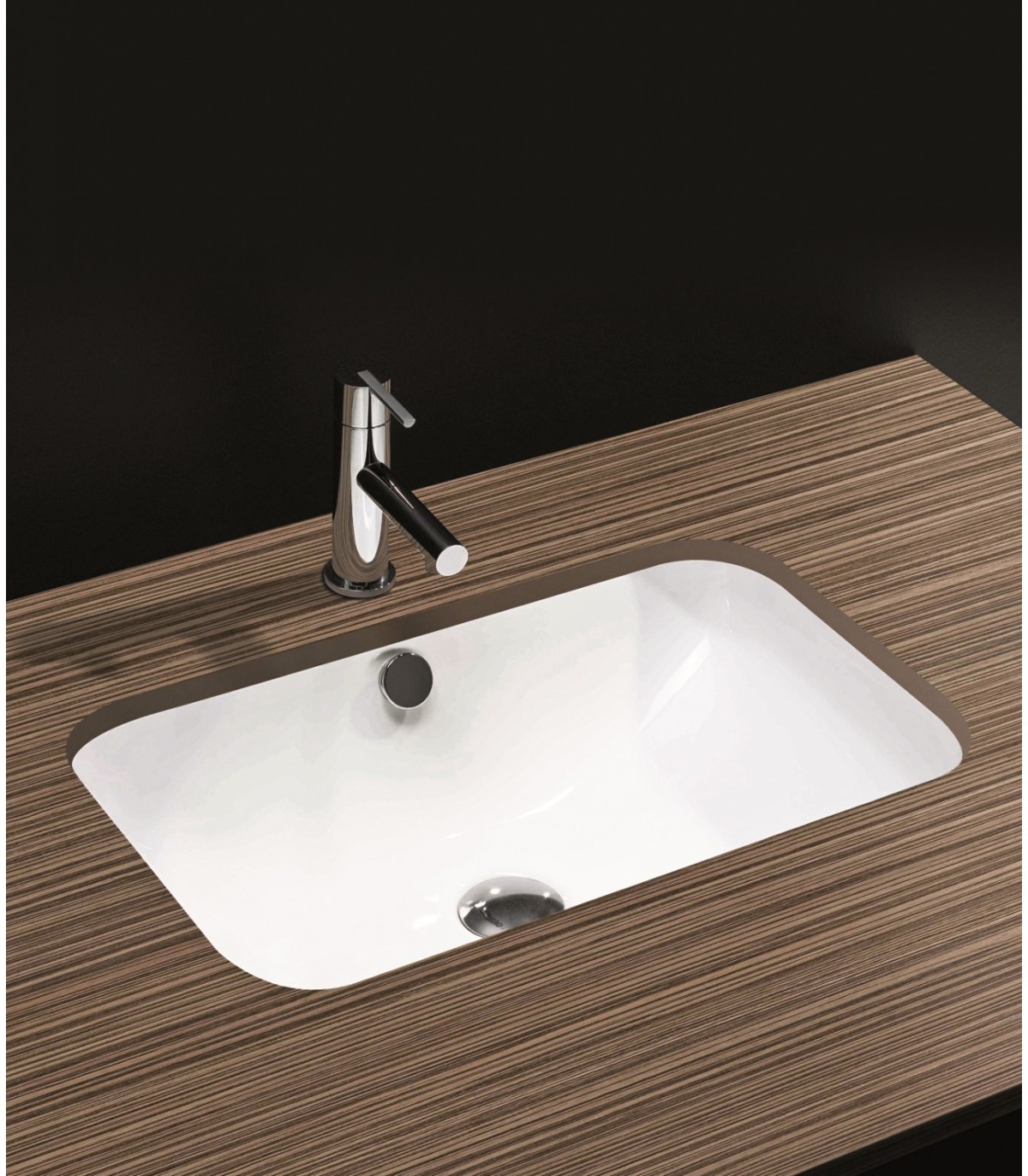 TANGER Lavabo rectangular de porcelana blanca para colocar bajo encimera. Medidas 55x35 cms. No incluye válvula ni sifón.