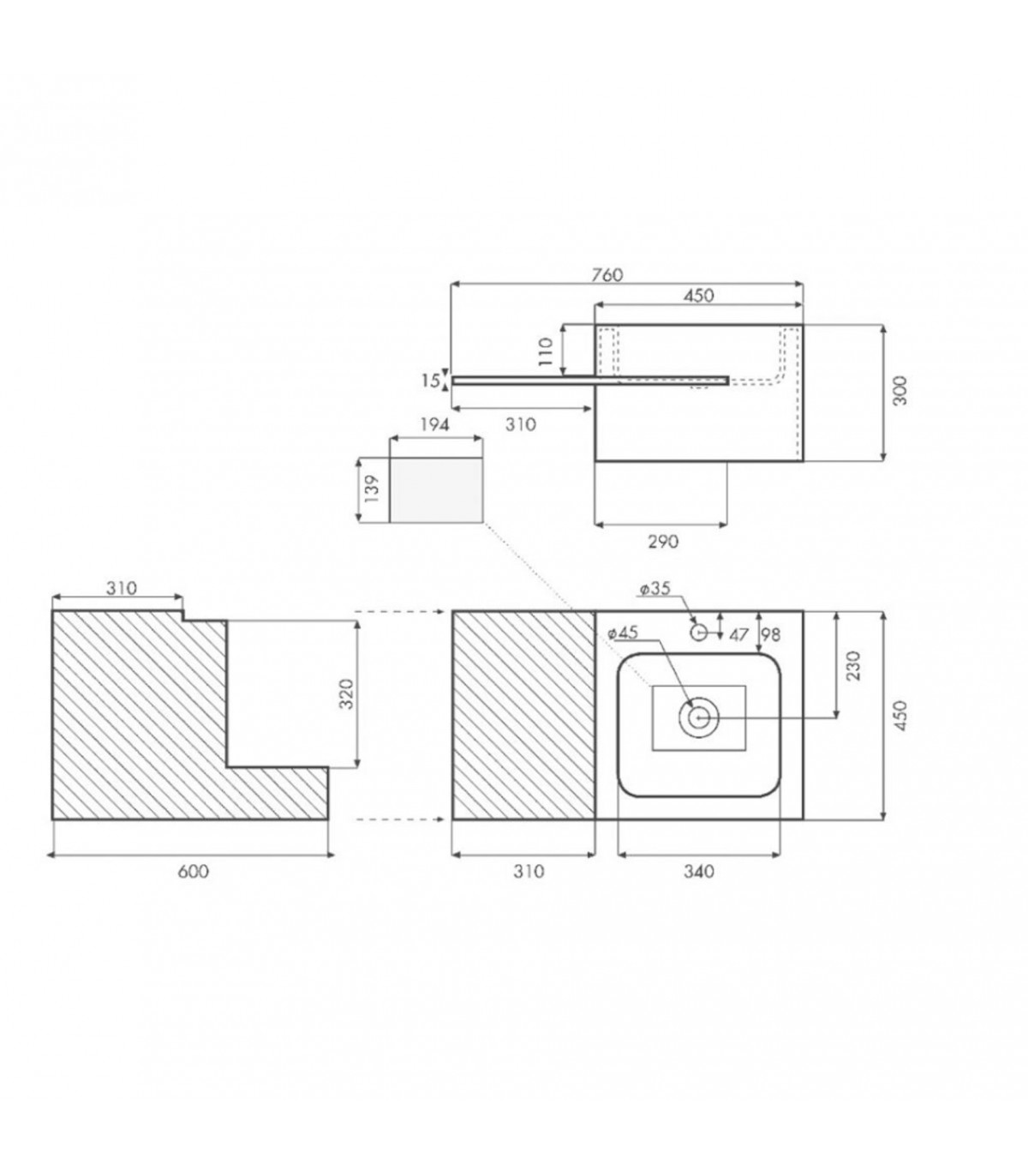 Lavabo Cuadr.c/Balda Izq Solid Surface CALABRIA 45x45