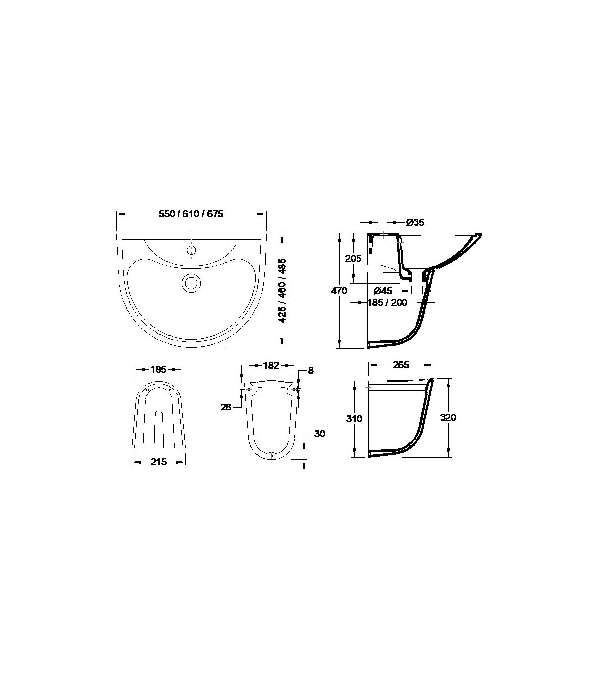 OCEANUS Lavabo suspendido con semipedestal. Disponible en 3 medidas. Incluye kit de fijación.