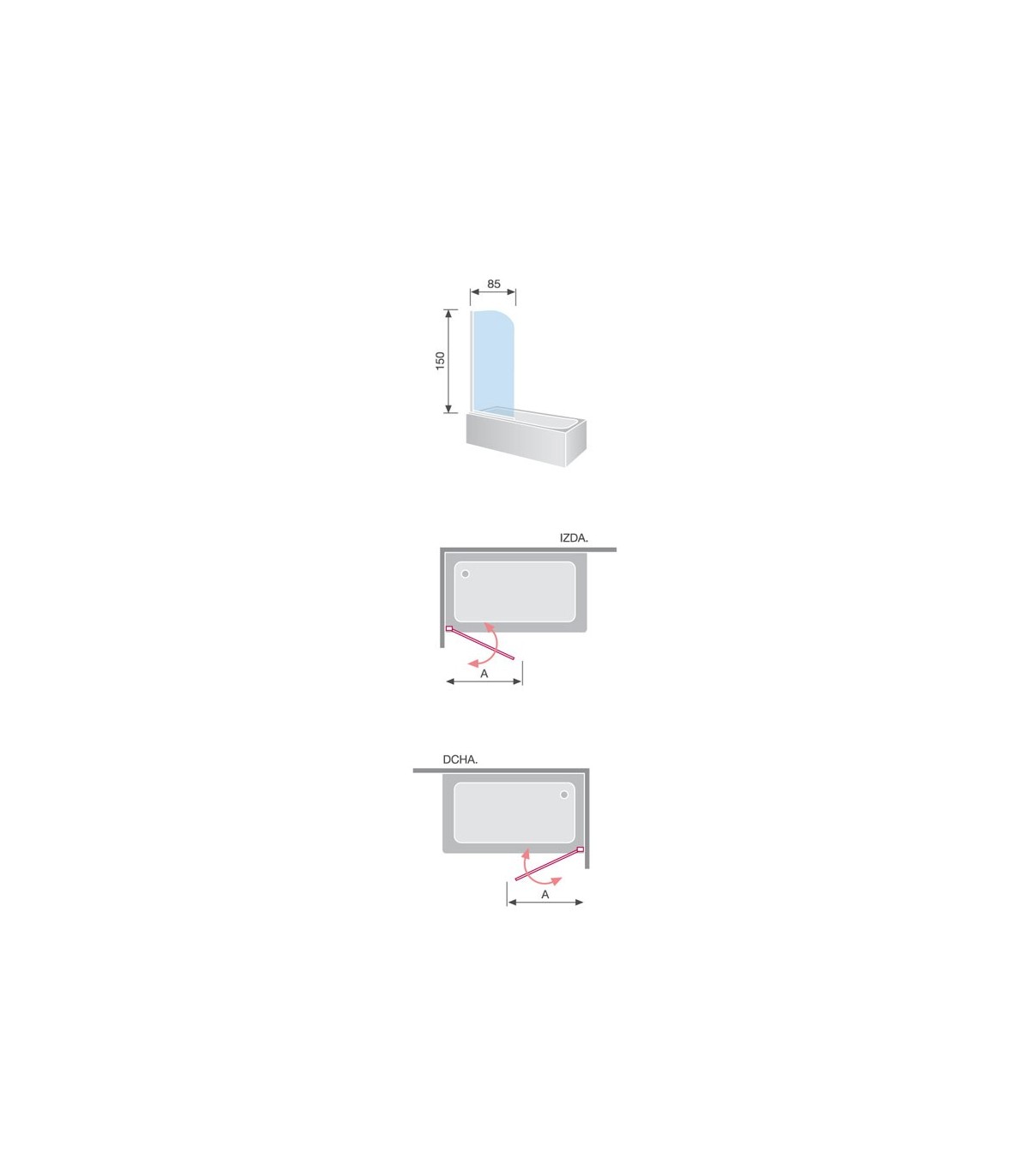 SERIE 300 Bañera abatible es una práctica mampara de una sola hoja, con perfil de aluminio anodizado plata alto brillo y vidrio securizado de 6 mm en transparente. Reversible.