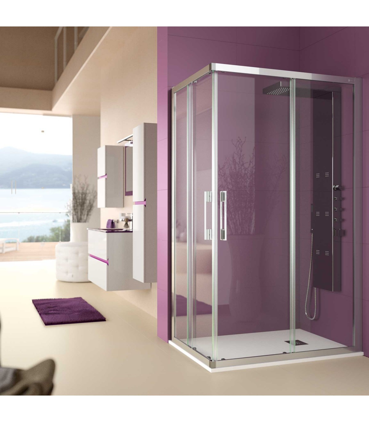 La serie CLEAR de mamparas compagina diseño y capacidad de adaptación. La mampara angular CLEAR está compuesta por dos puertas correderas y dos partes fijas, fabricadas con un cristal transparente templado de 6mm y un perfil de aluminio acabado plata brillo con asas cromadas. Sin perfil interior, para mayor elegancia y facilidad de limpieza.