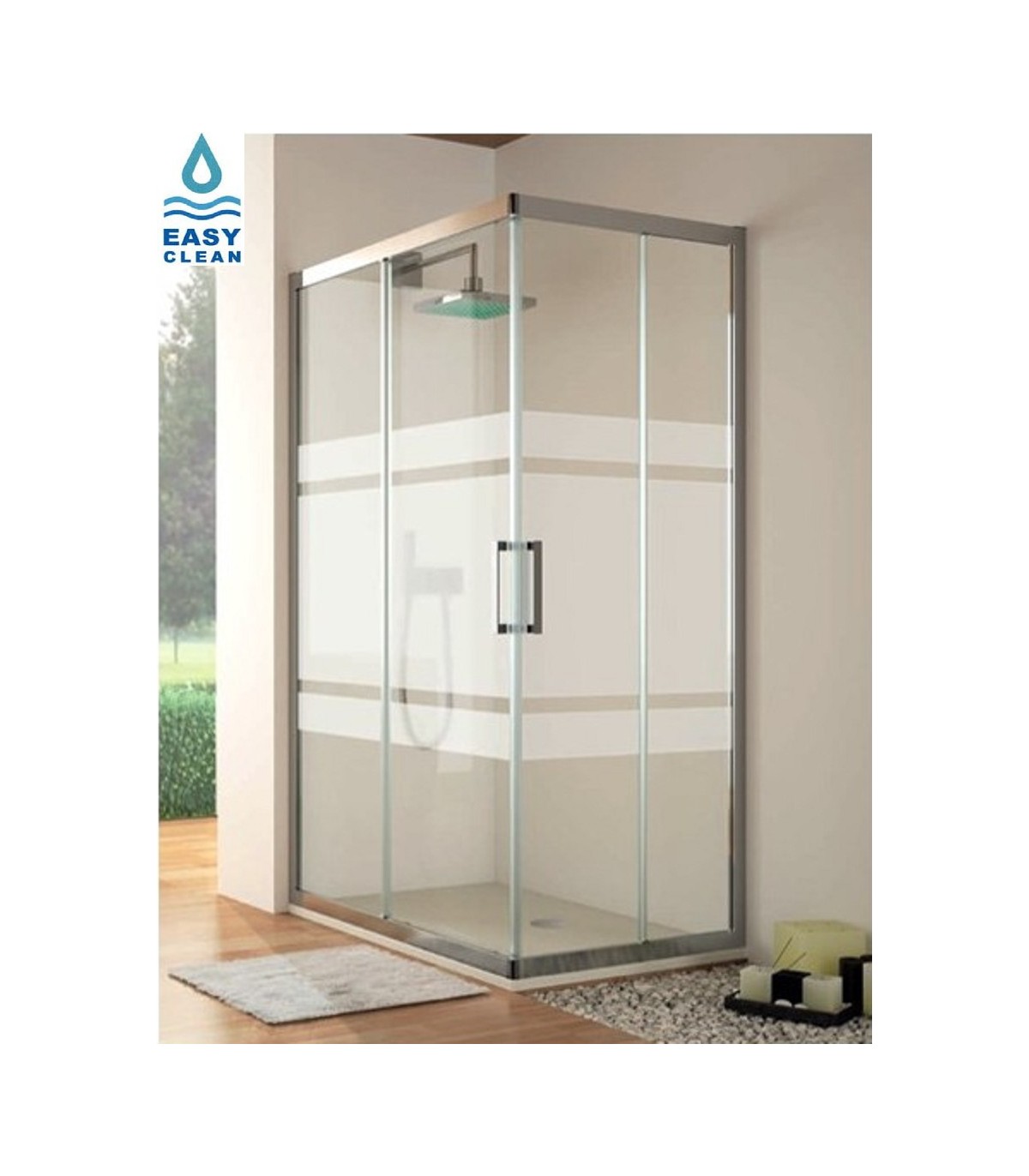 SERIE 300 es una colección de mampara en vidrio templado de 6 mm. La versión para platos de ducha angular está compuesta por dos hojas fijas y otras dos correderas, con apertura desde el vértice. Perfil de aluminio anodizado plata alto brillo y vidrio securizado en transparente o decorado Bali. Sistema de liberación de puertas para una cómoda limpieza. Tratamiento antical EASY-CLEAN incluido.