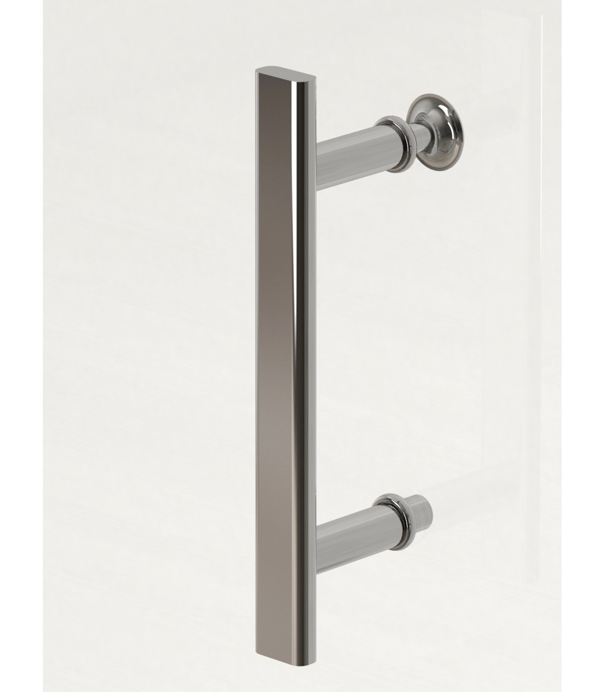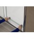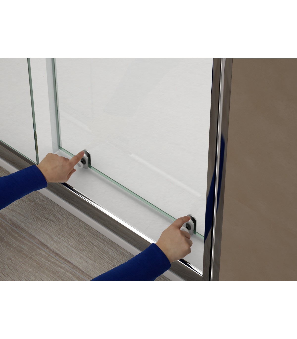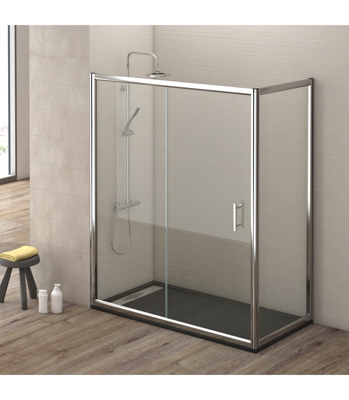 Mampara de ducha rectangular CLIO compuesta por un frontal de hoja fija con puerta corredera y cristal templado transparante de 5mm fijo en el ancho del plato de ducha. Altura 1900 mm. Reversible.