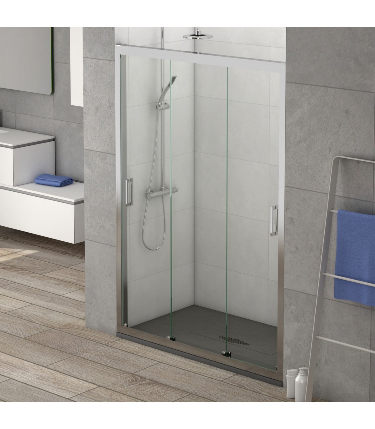 Mampara para frente de ducha, modelo BRISTOL con 3 puertas correderas. Cristal templado transparente de 6 mm. Altura 2000 mm. Tratamiento antical INLCUIDO. Apertura por ambos lados. Perfil de compensación de 25 mm incluido.