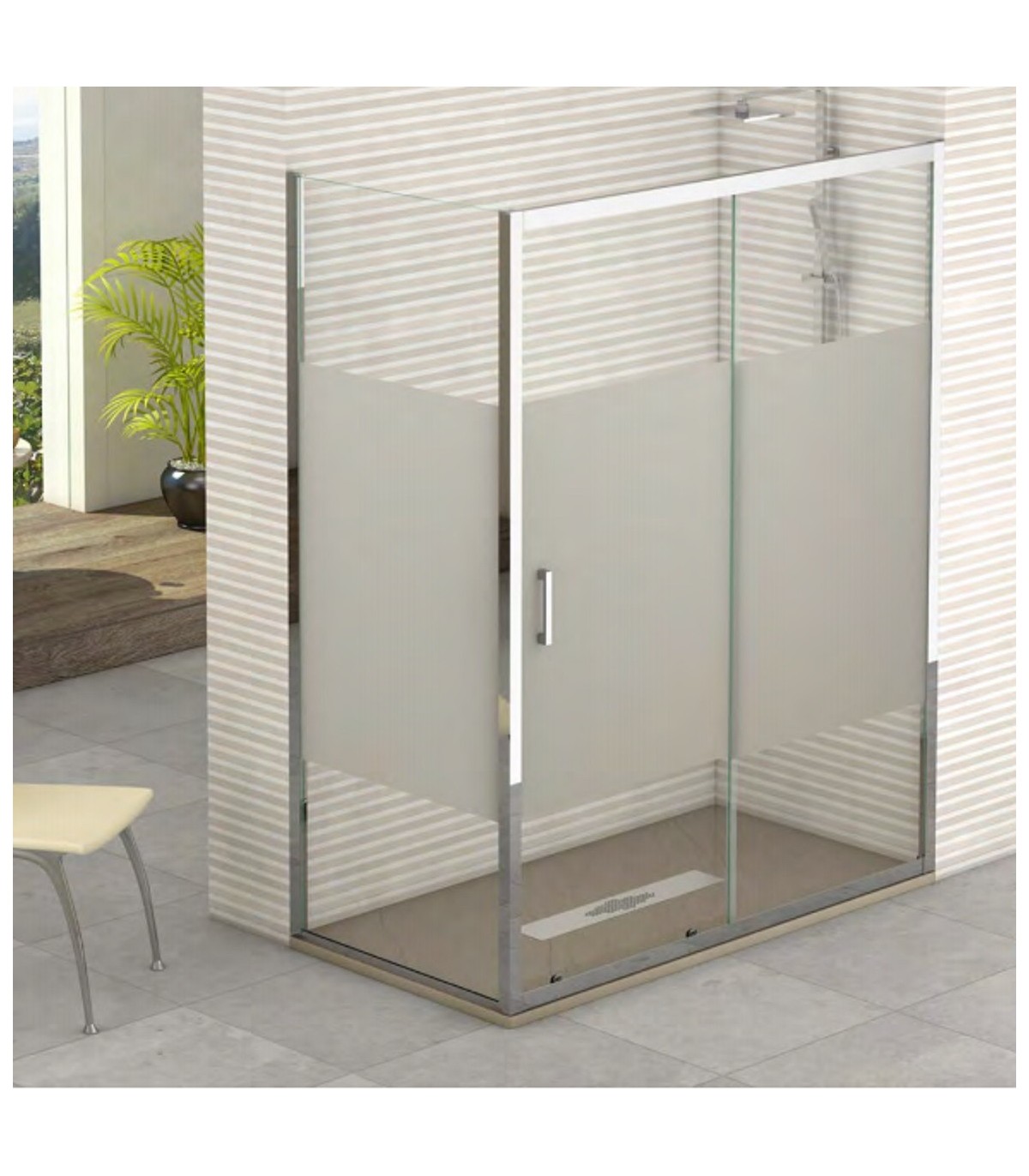 Mampara de ducha SINTRA, compuesta por frontal de una hoja fija y una puerta corredera, con lateral fijo en el ancho del plato. Cristal templado decorado de 6 mm. Altura 2000 mm. Incluye perfileria inferior y tratamiento antical. Mampara reversible. Perfíl aluminio cromado.