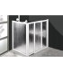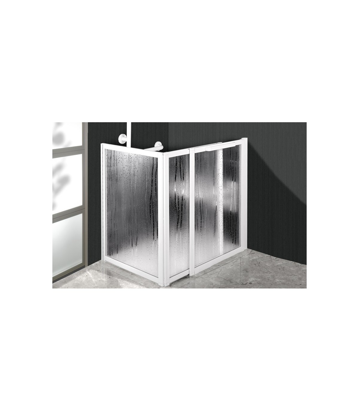 Mampara elevable de dos hojas correderas y una plegable que giran sobre el perfil de fijación a la pared modelo PrestoSan 5800 95800 (Montaje a izquierda) y PRESTOSAN 5801 ref. 95801 (Montaje a derecha).