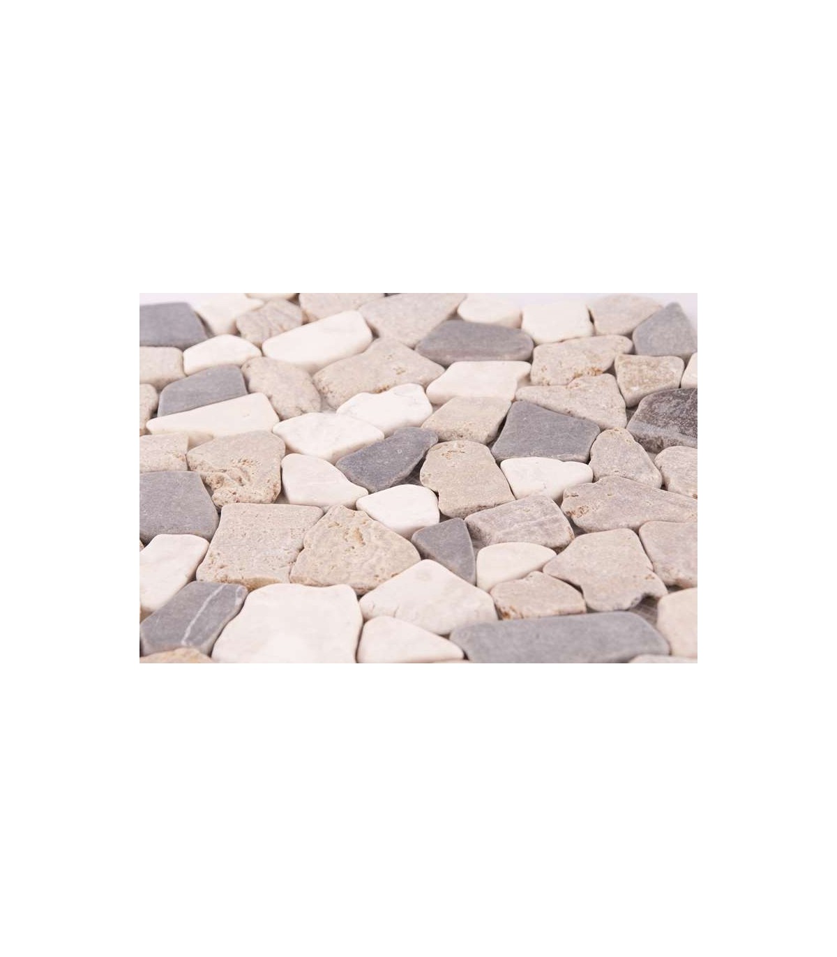 IRREGULAR Mosaico Mezcla con piedras planas de río montadas blanca, gris y sunset en mallas de 30,5x30,5. Ideal para platos de ducha o decoraciones especiales.