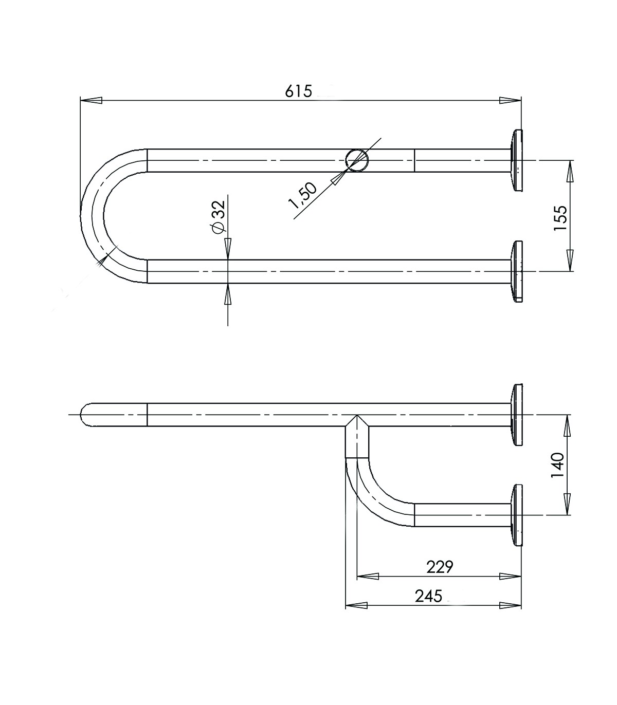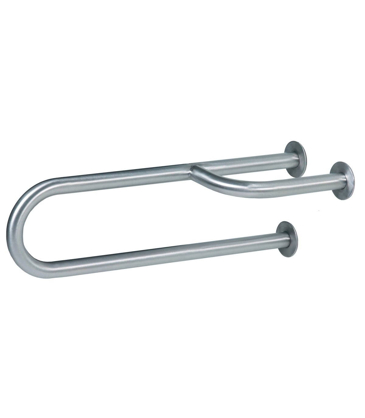 Barra de apoyo fija de tres puntos de anclaje, fabricada con tubo de acero doblado en forma de “U”, con un brazo lateral soldado y doblado a 90°, acabado acero inoxidable satinado.