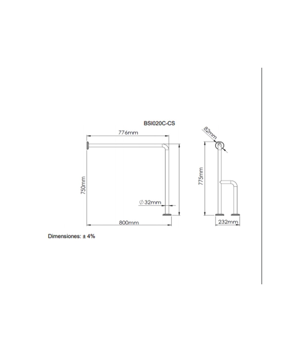 Características del Producto, Barra de 32 mm de diámetro y 1,5 mm de espesor. Incluye tornilleria de acero inox para paredes de ladrillo. La fuerza que soporta la barra dependerá del tipo de superficie y de la fijación utilizada.