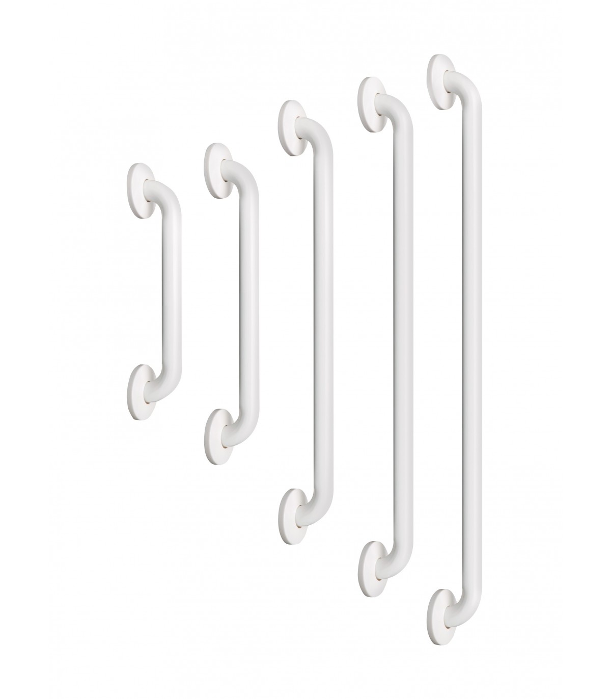 BARRA recta de apoyo y otras ayudas técnicas para personas de movilidad reducida. Fabricado en acero inoxidable y acabado en epoxi blanco. Barra de 32 mm de diámetro, con espesor de 1,5 mm y embellecedor de 85 mm.