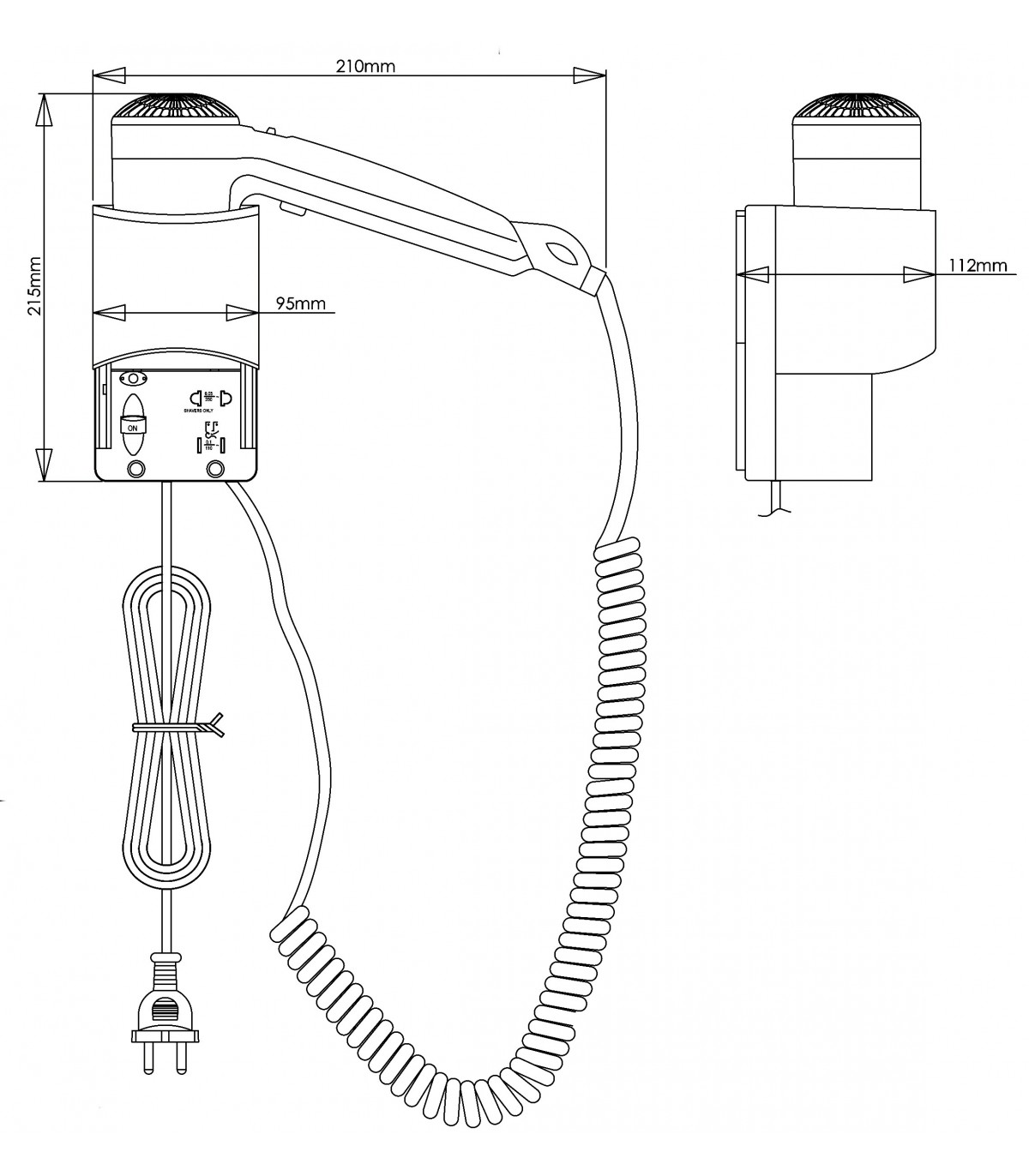 Secador de cabello de accionamiento manual, con interruptor de desconexión, soporte pared y 2 velocidades.
