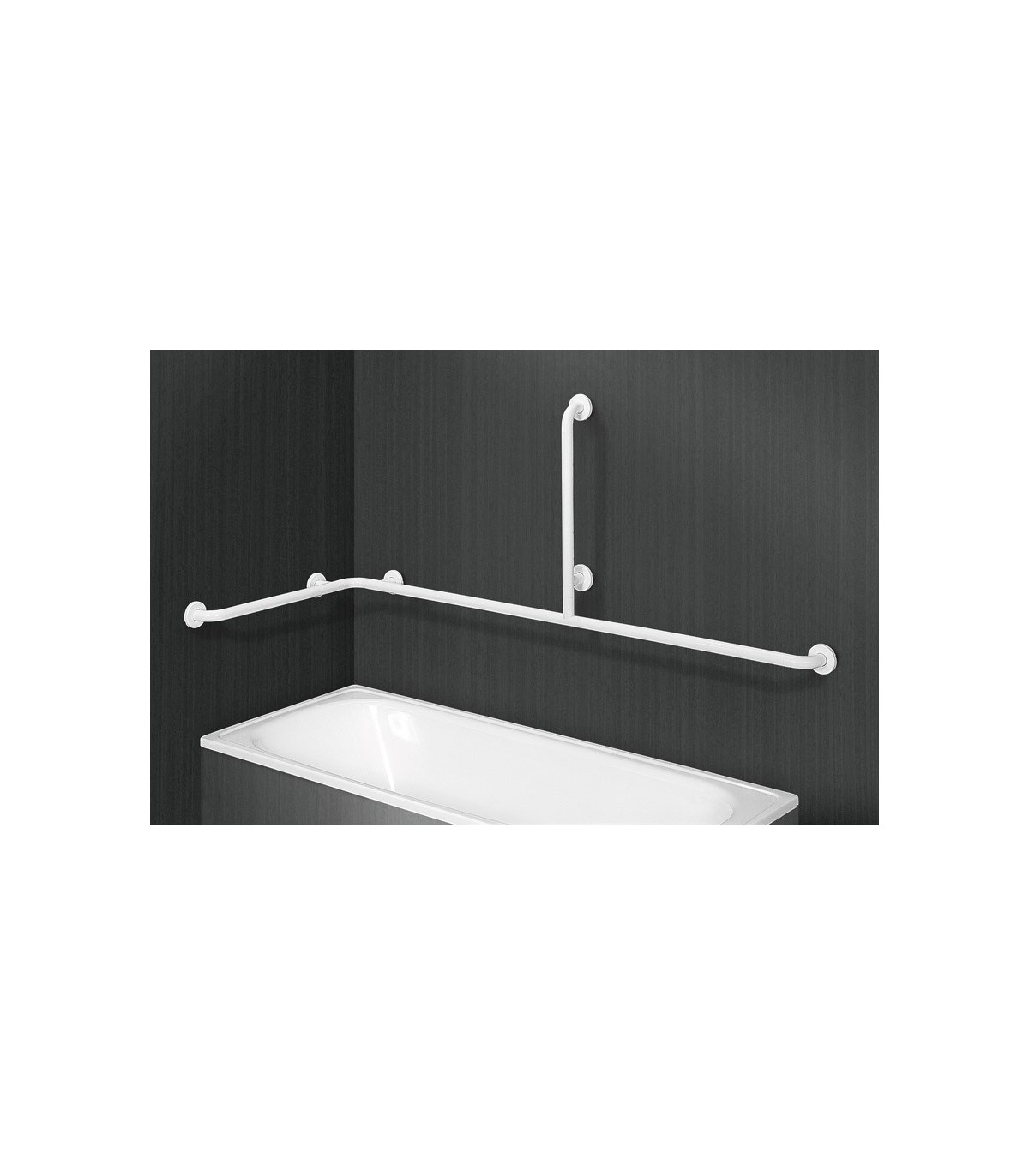 Barra de sujeción en ángulo para bañeras. Fabricada en aluminio recubierto de nylon.
