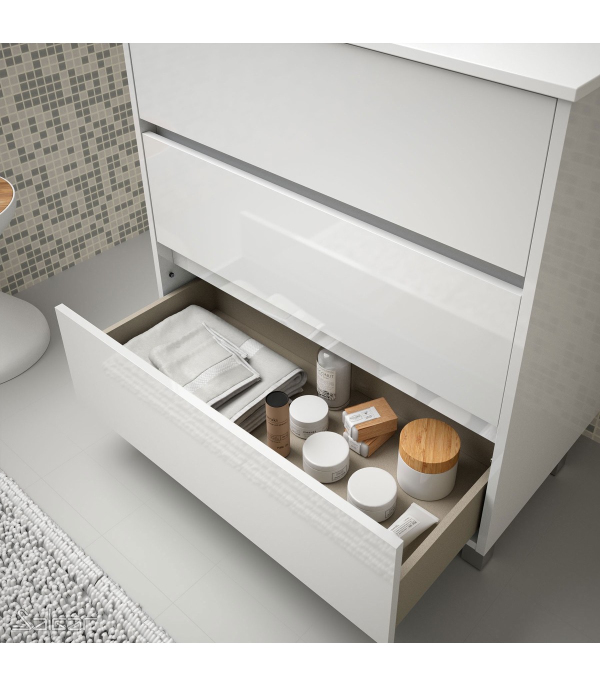 El mueble Arenys tiene un diseño contemporáneo que hará de tu cuarto de baño una estancia elegante y funcional con gran capacidad de almacenaje. El mueble dispone de tres cajones e incluye el lavabo cerámico blanco brillo con seno integrado. Todos los muebles de Salgar se envían montados. No incluye grifería, válvula de desagüe, sifón ni columna auxiliar a juego. Acabado en blanco brillo.