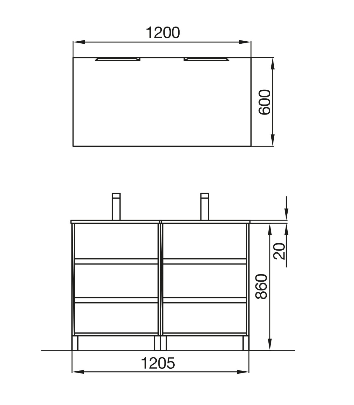 Mueble Arenys 1200 mm de fondo 45: Seis cajones con cierre con freno amortiguado, tirador tipo uñero, frente y laterales fabricados en tablero de partículas laminado de 16 mm con cantos en PVC. Dimensiones (mm): 1205 x 870 x 460 mm. Lavabo fabricado en porcelana blanca. Dimensiones (mm): 1205 x 19 x 460 mm. 1 espejo de luna pulida.