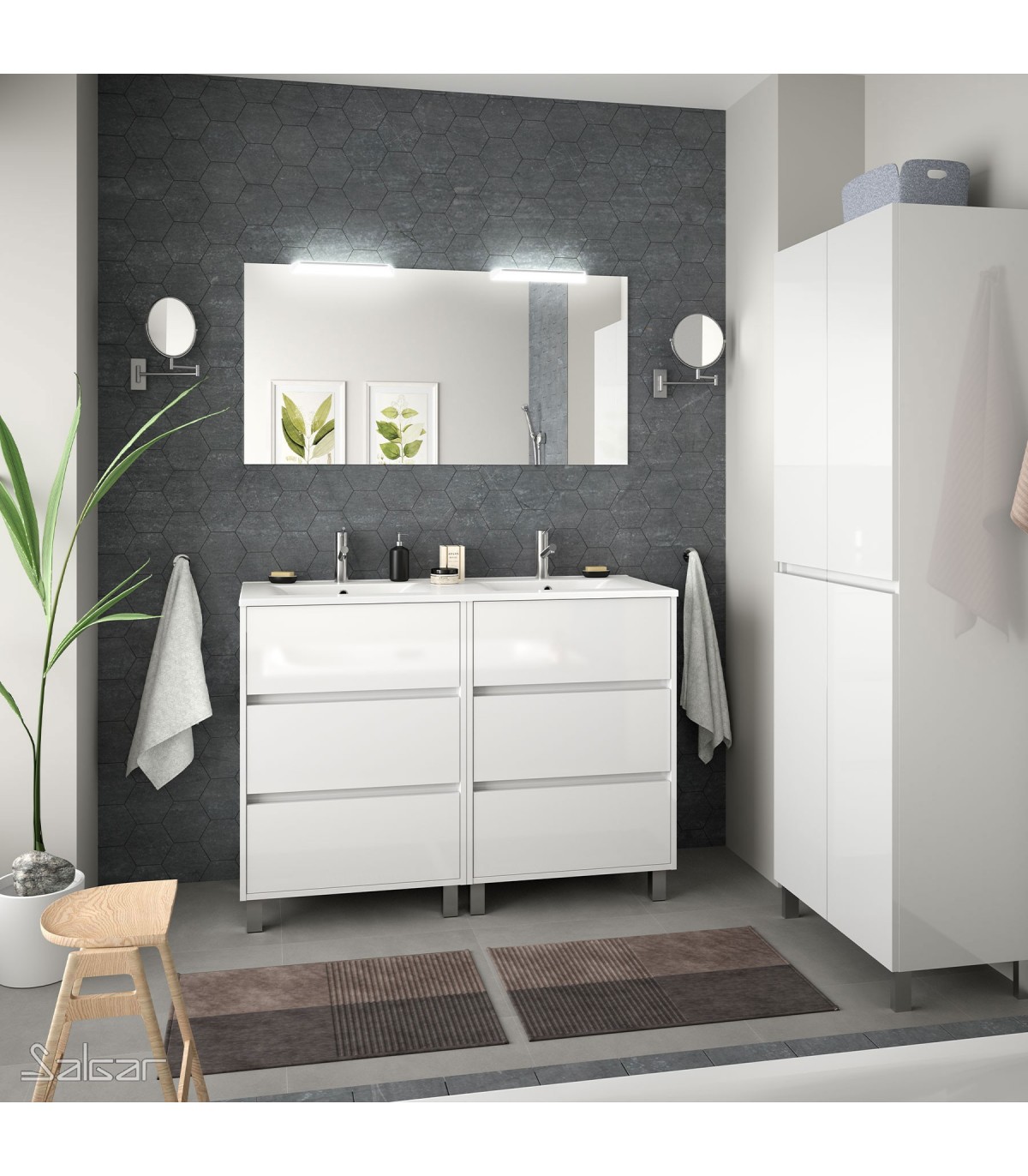 Conjunto formado por dos muebles suspendidos con tres cajones, lavabo de porcelana blanca brillo con la máxima resistencia al desgaste y espejo con dos apliques LED. Acabado en blanco brillo. Todos los muebles de Salgar se envían montados y preparados para su instalación. No incluye grifería, válvula de desagüe, sifón ni columna auxiliar a juego.