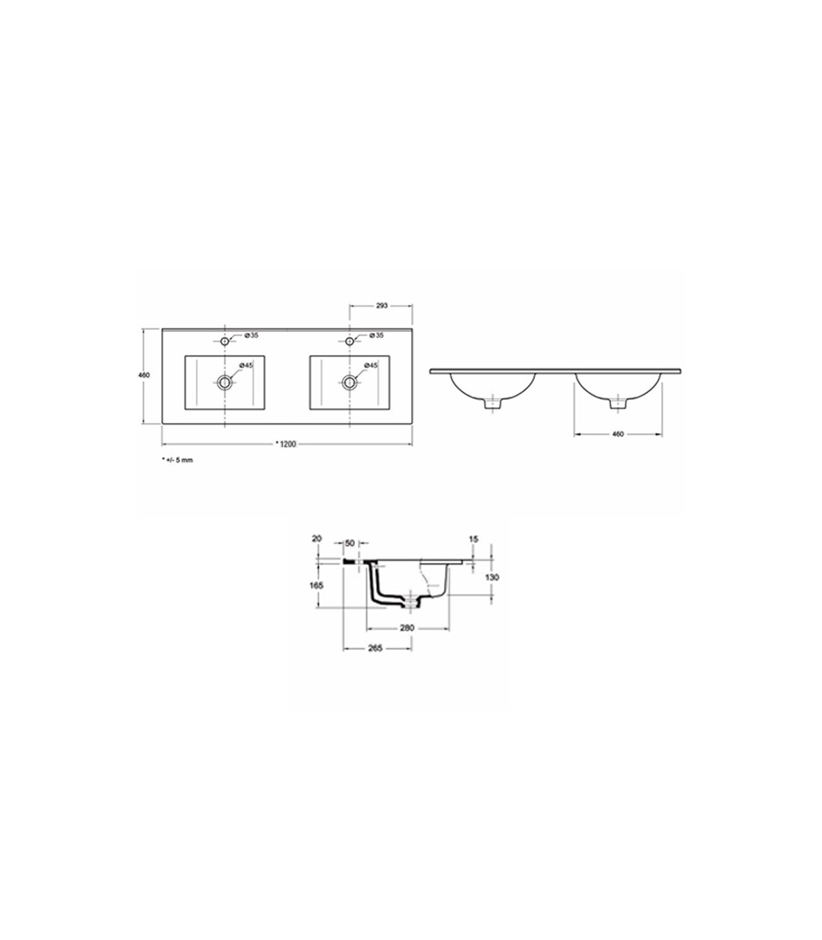 Mueble Arenys 1200mm de fondo 45: Seis cajones con cierre con freno amortiguado, tirador tipo uñero integrado en el frente del mueble, frente y laterales fabricados en tablero de partículas laminado de 16mm con cantos en PVC. Dimensiones(mm): 1205x870x460mm. Lavabo fabricado en porcelana blanca brillo. Dimensiones(mm): 1205x 9x460mm.