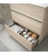 La serie Arenys destaca por su característico mueble de tres cajones. El conjunto está formado mueble de tres cajones con cierre amortiguado, lavabo cerámico blanco brillo, espejo y aplique LED. Todos los muebles de Salgar se envían montados y preparados para su instalación. No incluye grifería, válvula de desagüe, sifón ni columna auxiliar a juego. Acabado en Roble Caledonia.