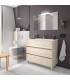 Mueble Arenys de fondo 45 cms de tres cajones con cierre. Tirador tipo uñero integrado en el frente del mueble aunando funcionalidad y diseño. Frente y laterales fabricados en tablero de partículas laminado de 16 mm (clase E-1) con cantos en PVC (con cola PUR). Lavabo fabricado en porcelana blanca. Espejo de luna pulida en medidas iguales al ancho del mueble.