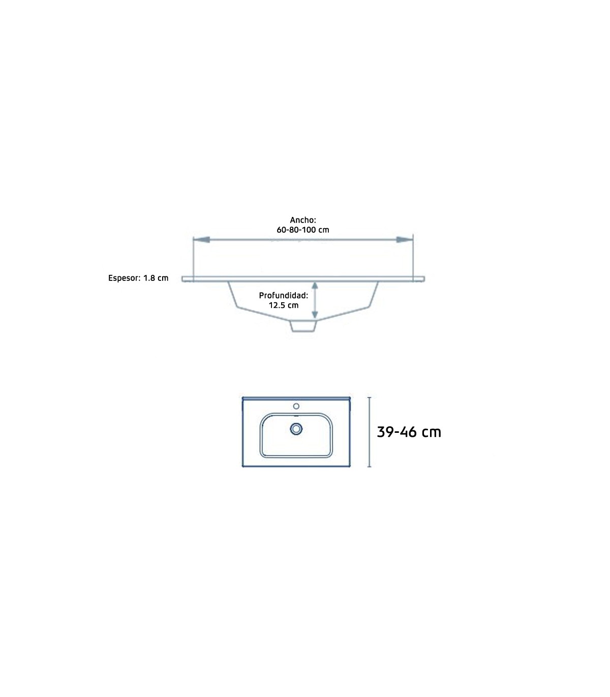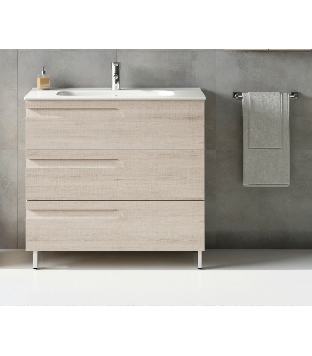 La versión completa está compuesto por:   - Mueble con 3 cajones fabricado con estructura en tablero de 16mm y frente en polilaminado de 18mm. Cajones con guías de extración total y cierre amortiguado. Juego de 4 patas de alumino   - Lavabo cerámico SLIM de fondo 46 cm